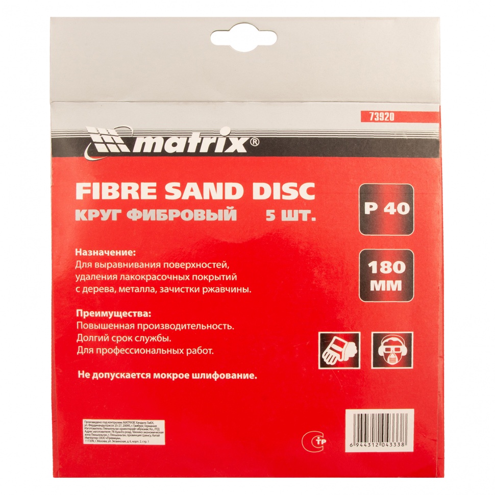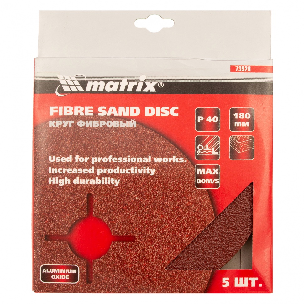 Фибровый круг Matrix 73920 размером 180 х 22 мм, с абразивом P 40, 5 шт. в упаковке, устанавливается на углошлифовальную машину (УШМ) при помощи опорной тарелки для фибровых кругов. Крупнозернистый абразив Р 40 используется для грубой обработки металлических, каменных и деревянных изделий, позволяет удалять лак, краску, заусенцы, ржавчину, затирать швы и устранять брызги после сварки. Благодаря прочной основе ресурс у фибровых кругов в 2-3 раза больше, чем у шлифкругов «под липучку».