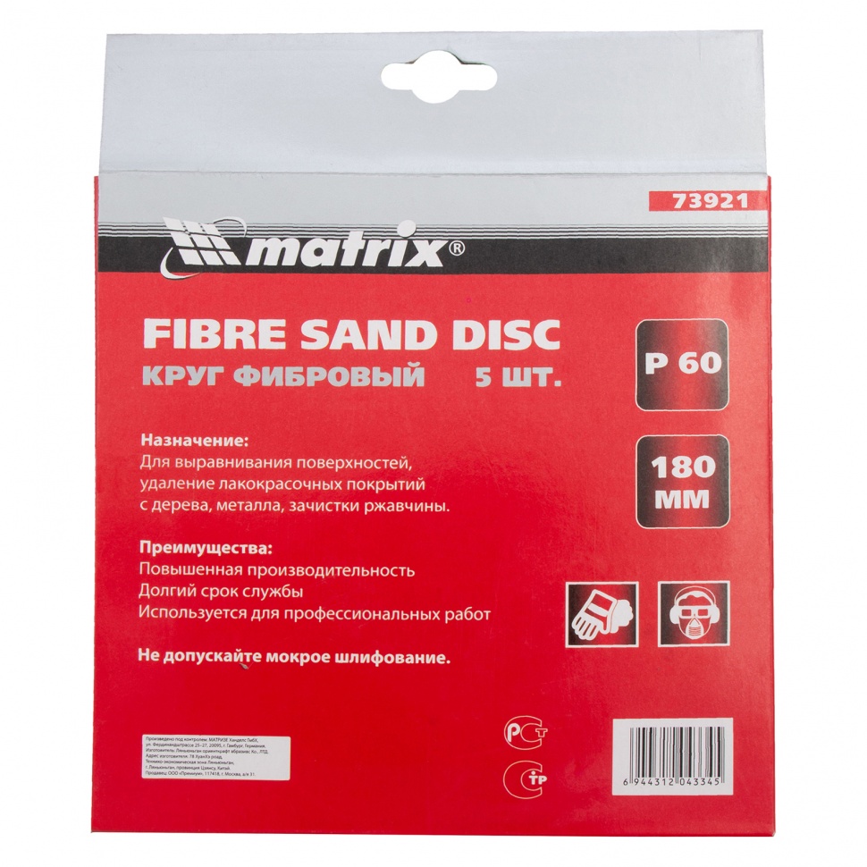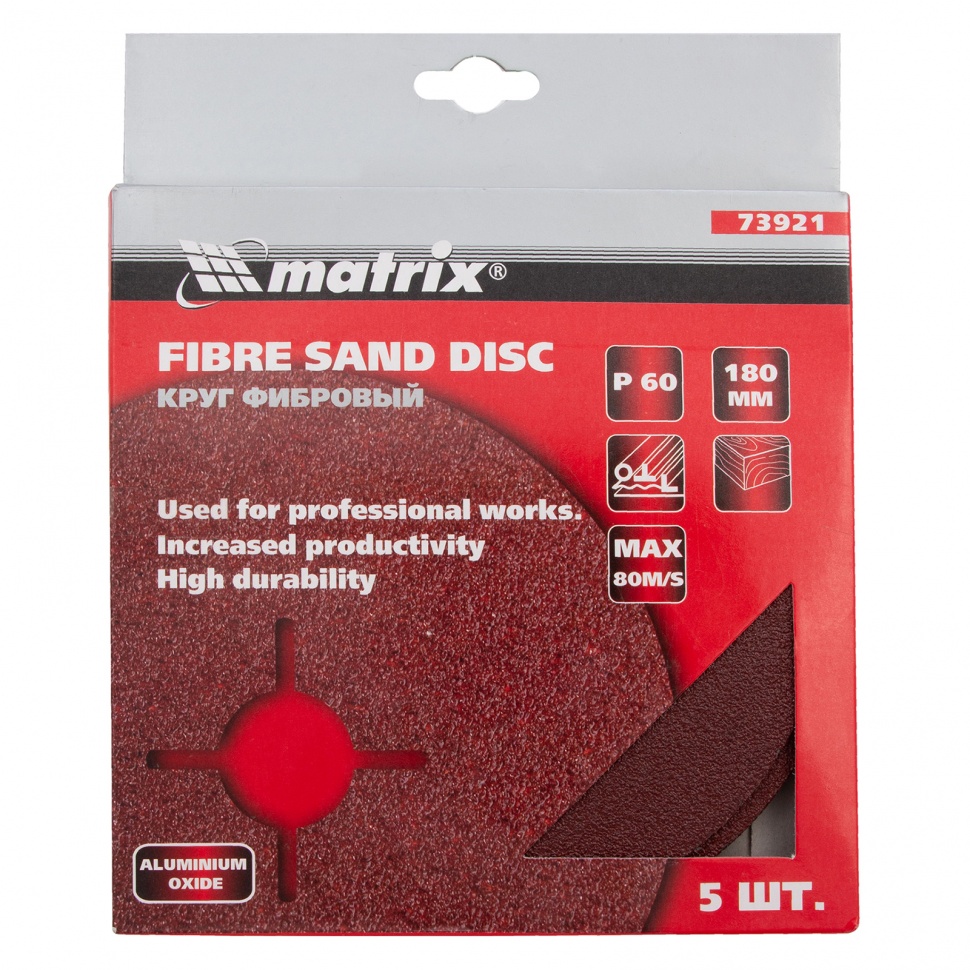 Фибровый круг Matrix 73921 размером 180 х 22 мм, с абразивом P 60, 5 шт. в упаковке, устанавливается на углошлифовальную машину (УШМ) при помощи опорной тарелки для фибровых кругов. Крупнозернистый абразив Р 60 используется для грубой обработки металлических, каменных и деревянных изделий, позволяет снимать старые лакокрасочные покрытия, удалять заусенцы и сварные швы, следы ржавчины и потертости. Благодаря прочной основе ресурс у фибровых кругов в 2-3 раза больше, чем у шлифкругов «под липучку».