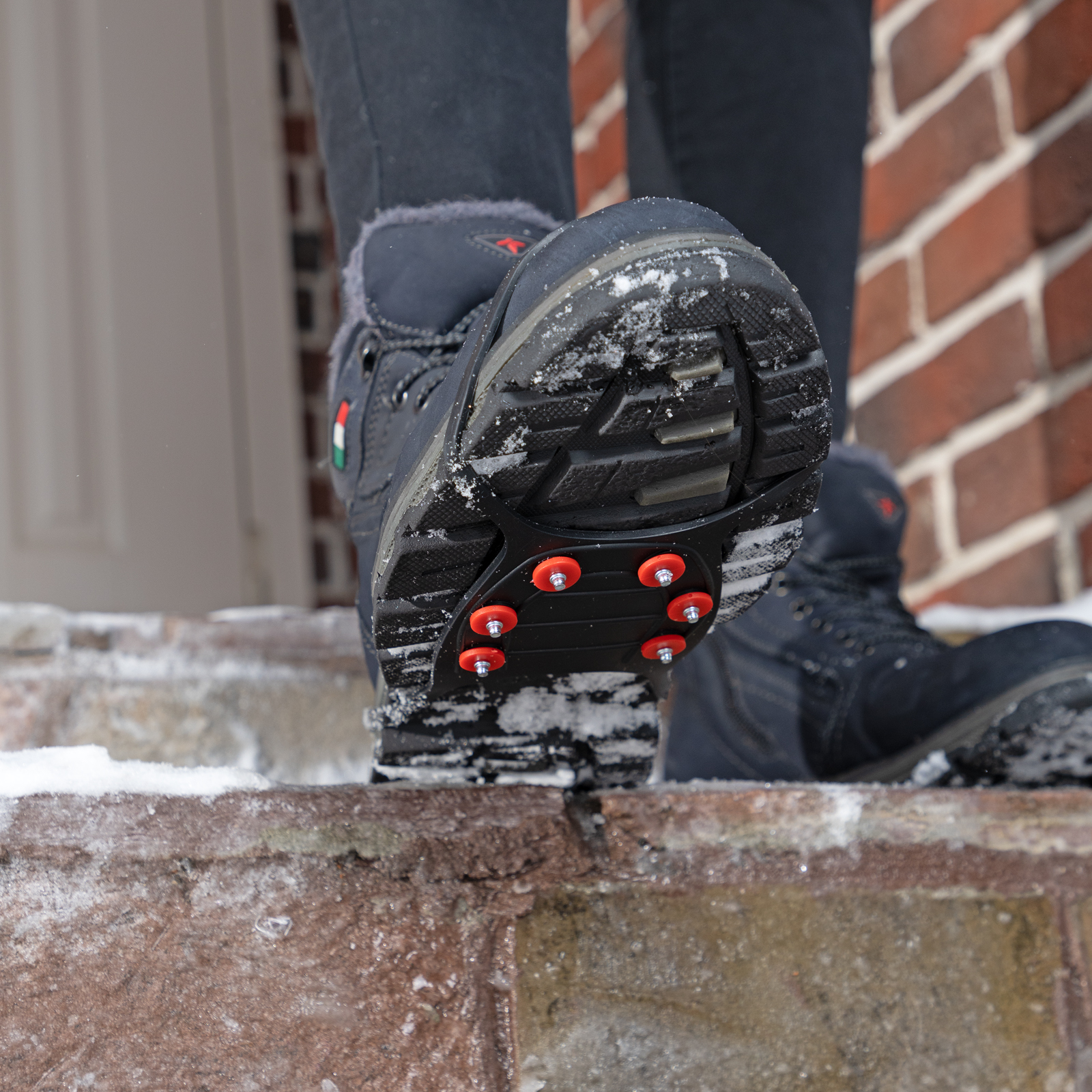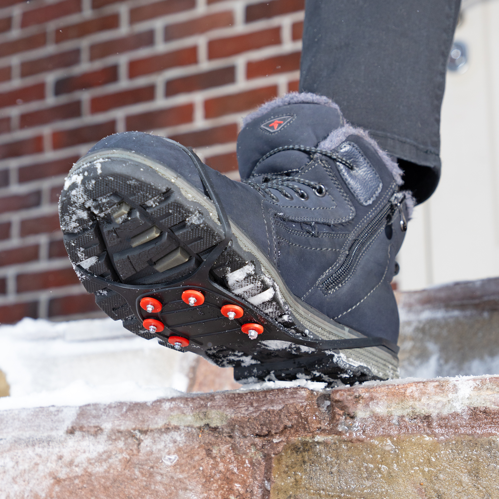 - Стальные шипы не гнутся и не истираются, а заостренные зубцы глубоко проникают в лед, исключая падение человека.