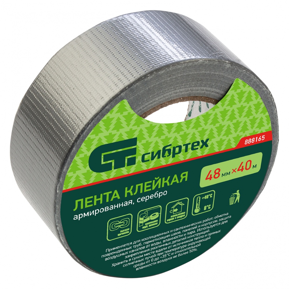 Клейкая армированная лента Сибртех 888165 размером 48 мм х 40 м, цвета серебра, используется для проведения изоляционных, сантехнических и монтажных работ. Применяется для обмотки поврежденных труб, герметизации швов, панелей и корпусов. Обеспечивает надежную изоляцию от влажности и пара. Позволяет также закреплять детали различных конструкций.