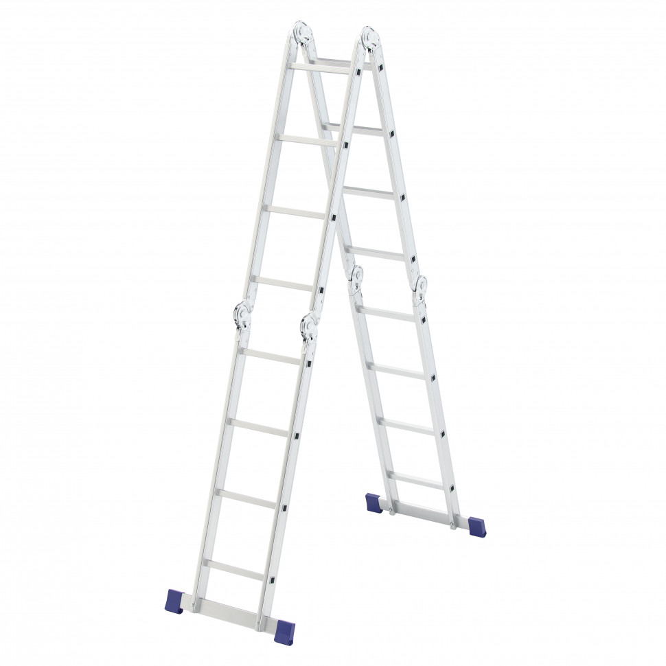 Шарнирная алюминиевая лестница Сибртех 97882 представляет собой 4 секции по 4 ступени, которые можно настроить в нескольких рабочих положениях. Она может использоваться в качестве приставной лестницы, двухсторонней стремянки и помоста. Будет полезна как в быту, так и на небольших стройках, в гараже и магазинах.