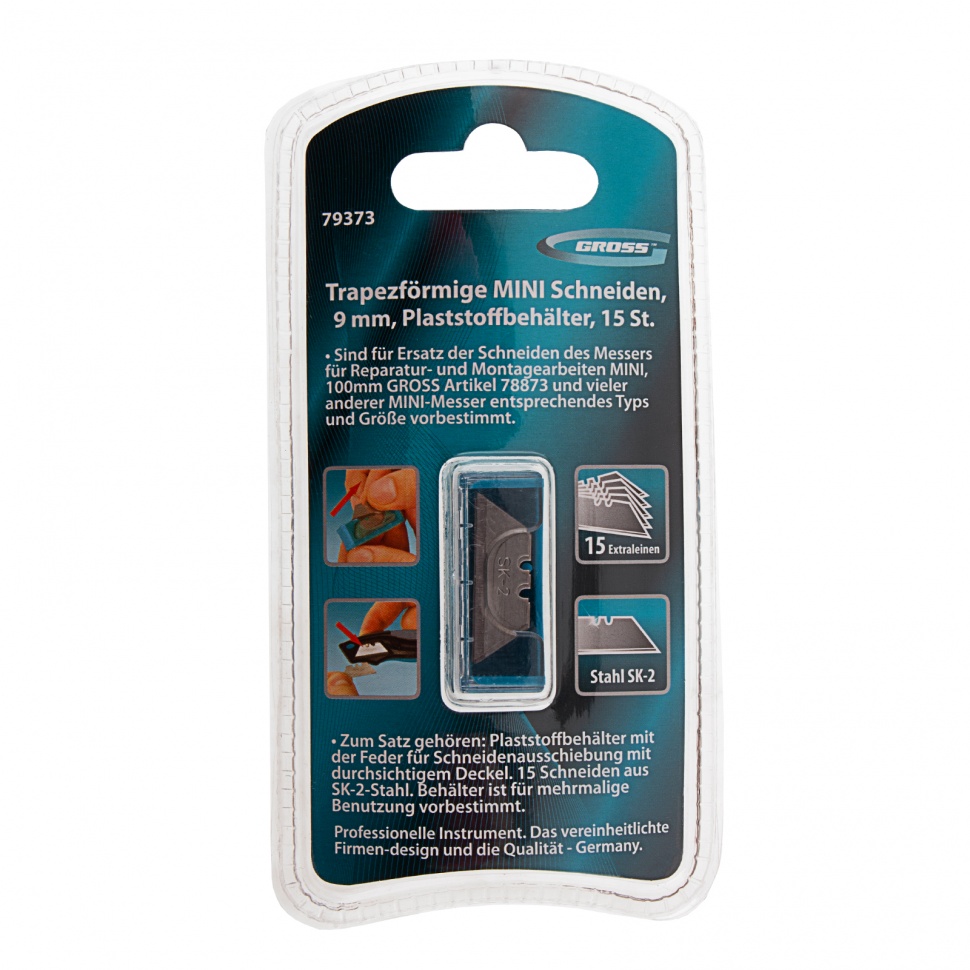 Трапециевидные лезвия Gross МИНИ 79373 шириной 9 мм и длиной 28 мм, 15 шт. в пластиковом пенале, предназначены для установки в монтажный нож Gross 78873. Используются при проведении ремонтных и отделочных работ для разрезания бумаги, картона, раскройки линолеума или обоев.
