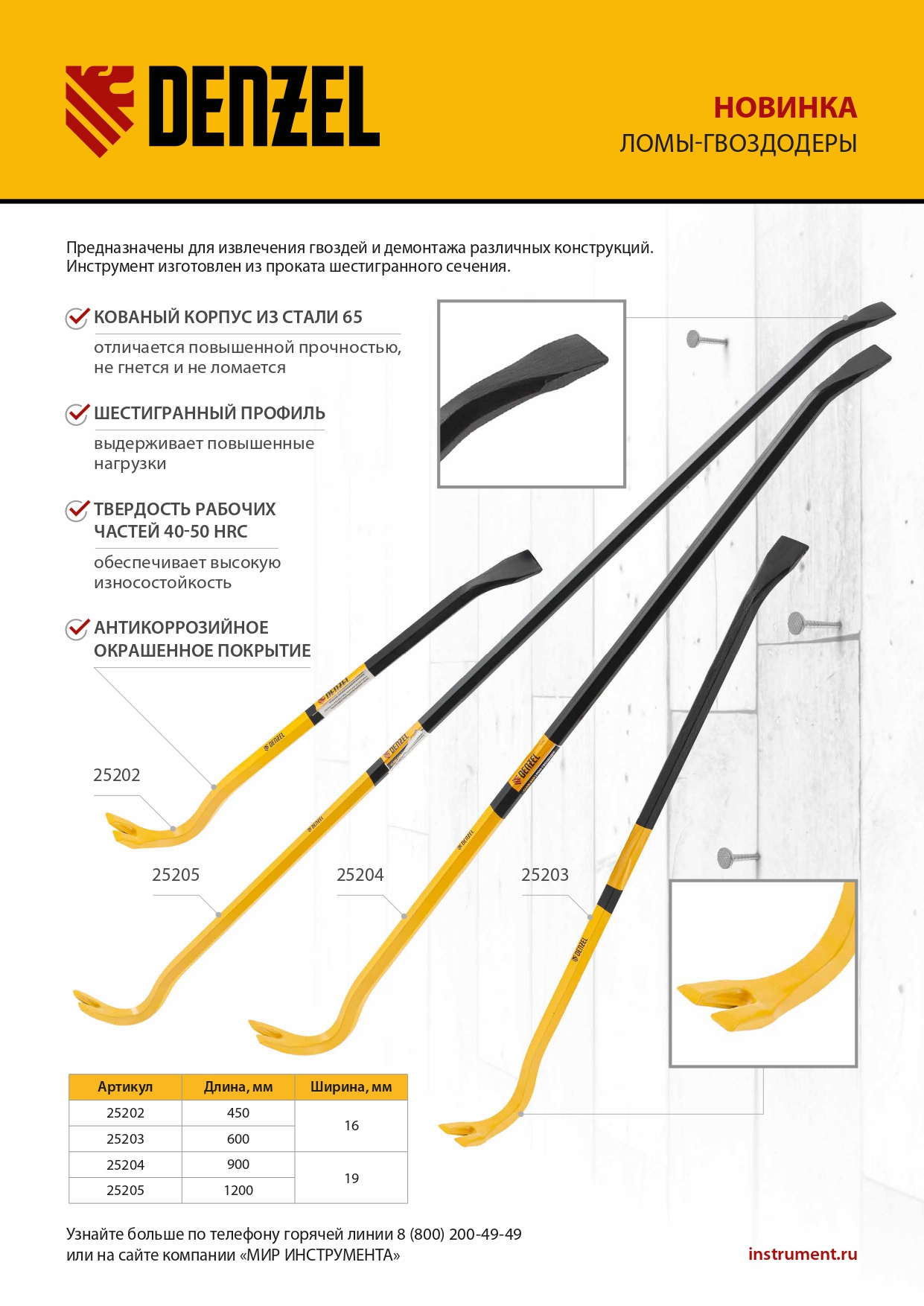 Лом-гвоздодер Denzel 25205 длиной 1200 мм, из стали 65, с шестигранным профилем размером 19 мм и окрашенной поверхностью, предназначен для извлечения гвоздей и демонтажа различных конструкций. Изготовлен из проката шестигранного сечения и выдерживает повышенные нагрузки. Инструмент используется для проведения ремонтных и демонтажных работ.