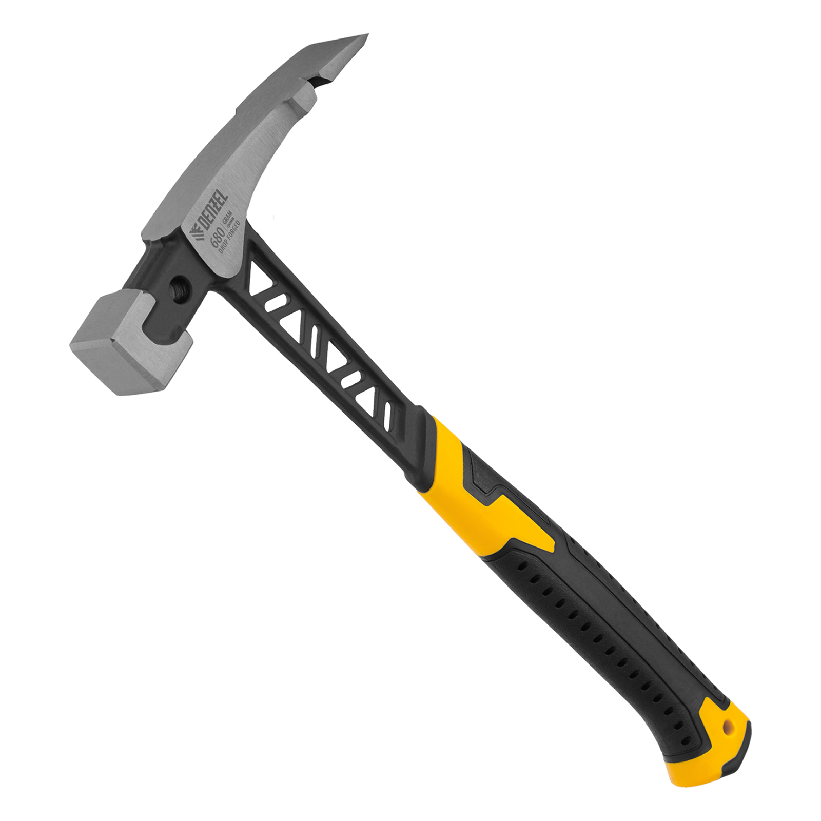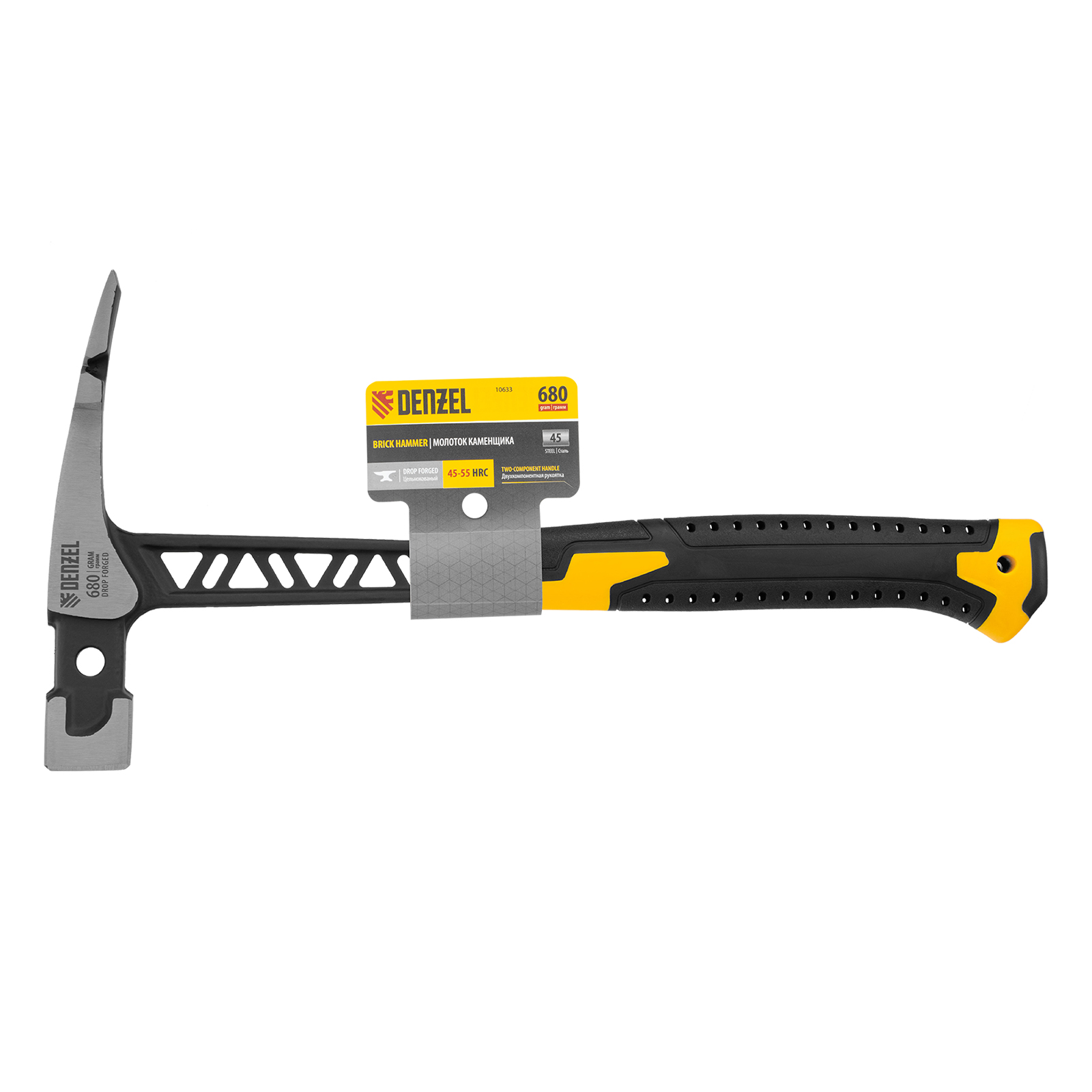 Цельнокованый молоток каменщика Denzel 10633 с бойком весом 680 г, с двухкомпонентной обрезиненной рукояткой, используется для выполнения работ с каменной или кирпичной кладкой. Квадратный боек предназначен для нанесения ударов, а удлиненный заточенный носок — для разрубания камня или кирпича. Гвоздодер применяется для выпрямления небольших гвоздей.