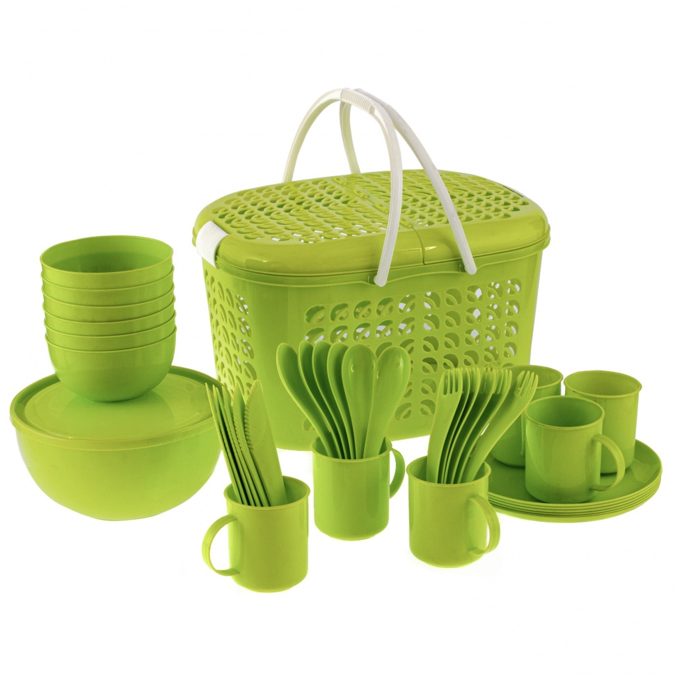 - Оптимальная комплектация — набор включает в себя все необходимое для отдыха на природе: тарелки, стаканы, миски, столовые приборы, большой салатник с крышкой и удобную корзину для переноски.