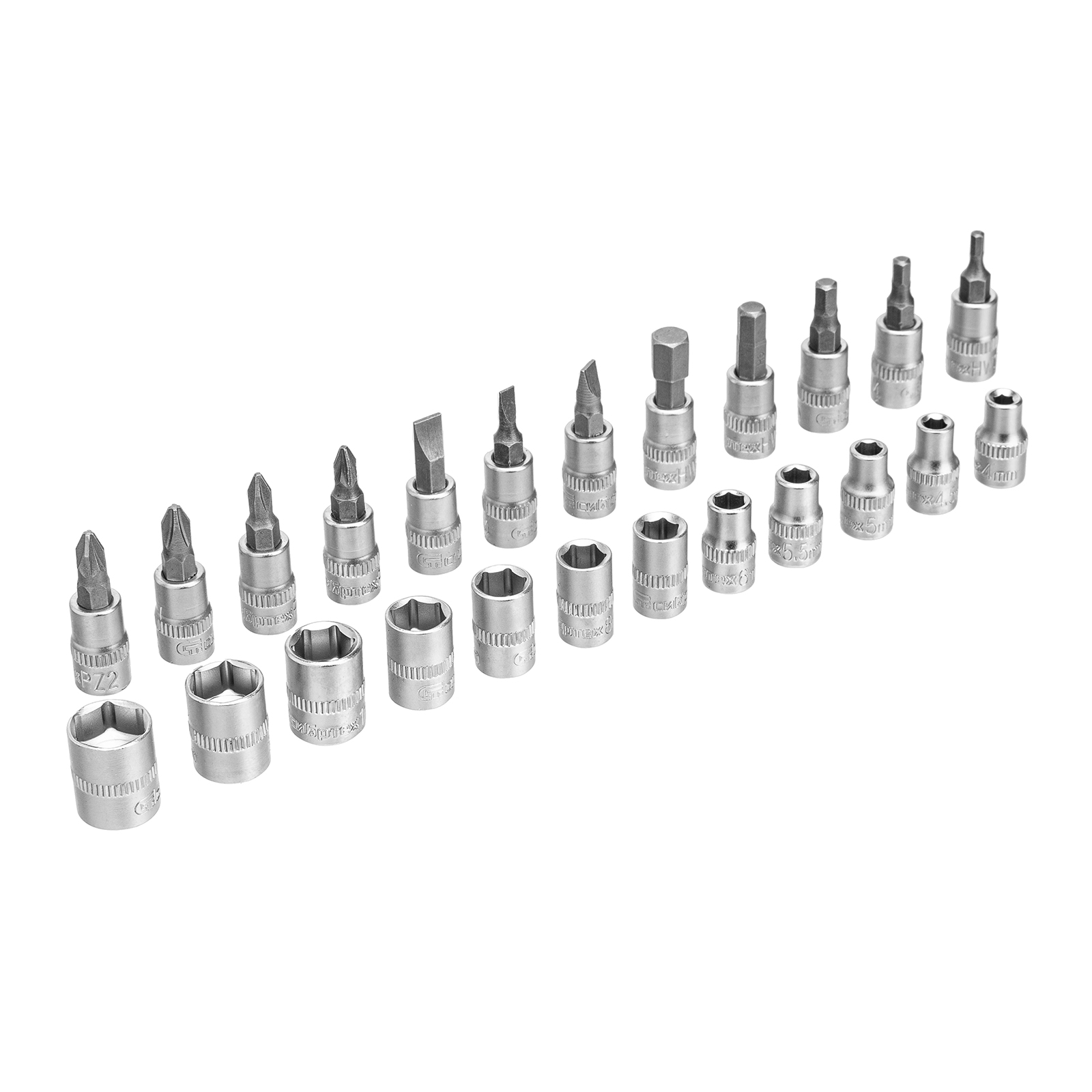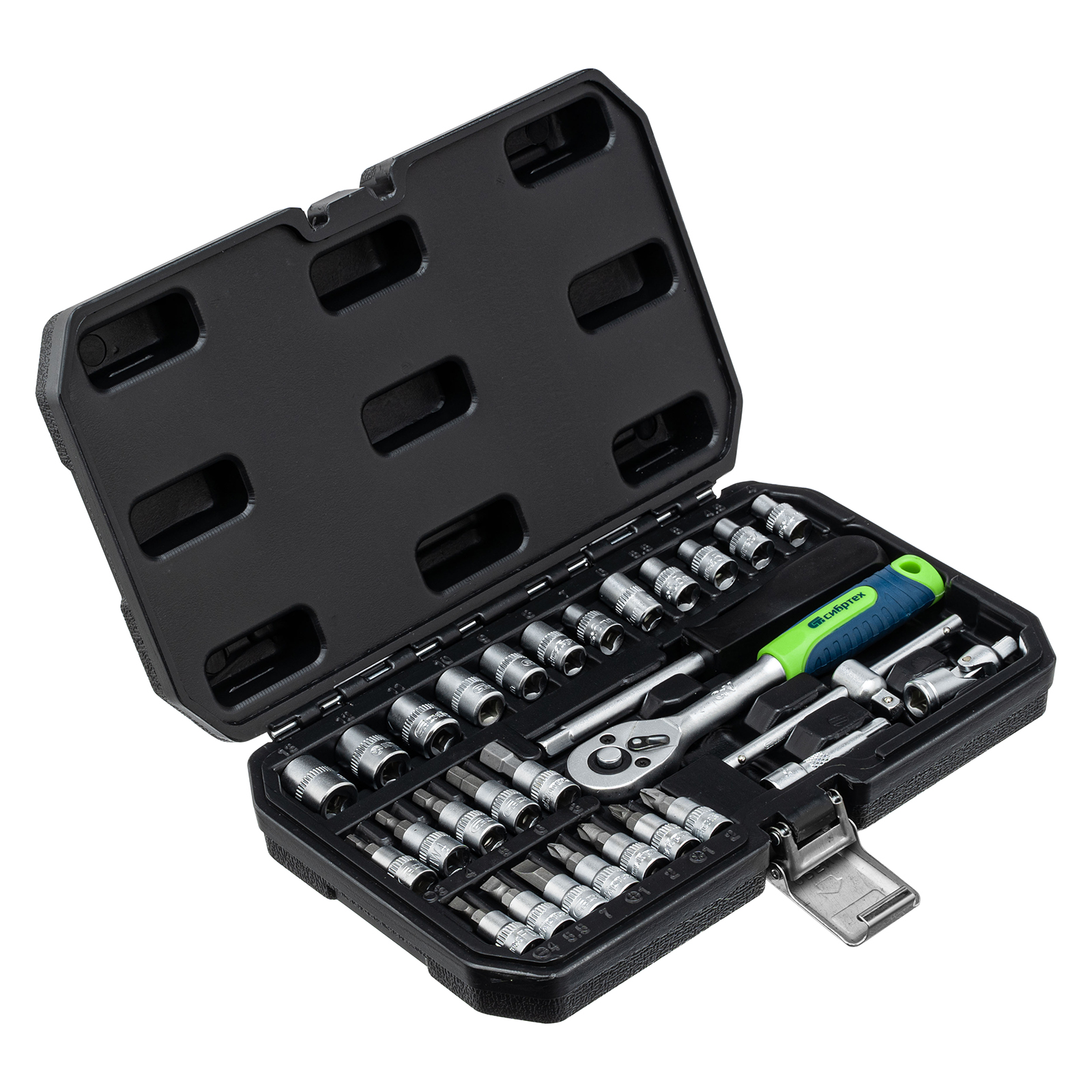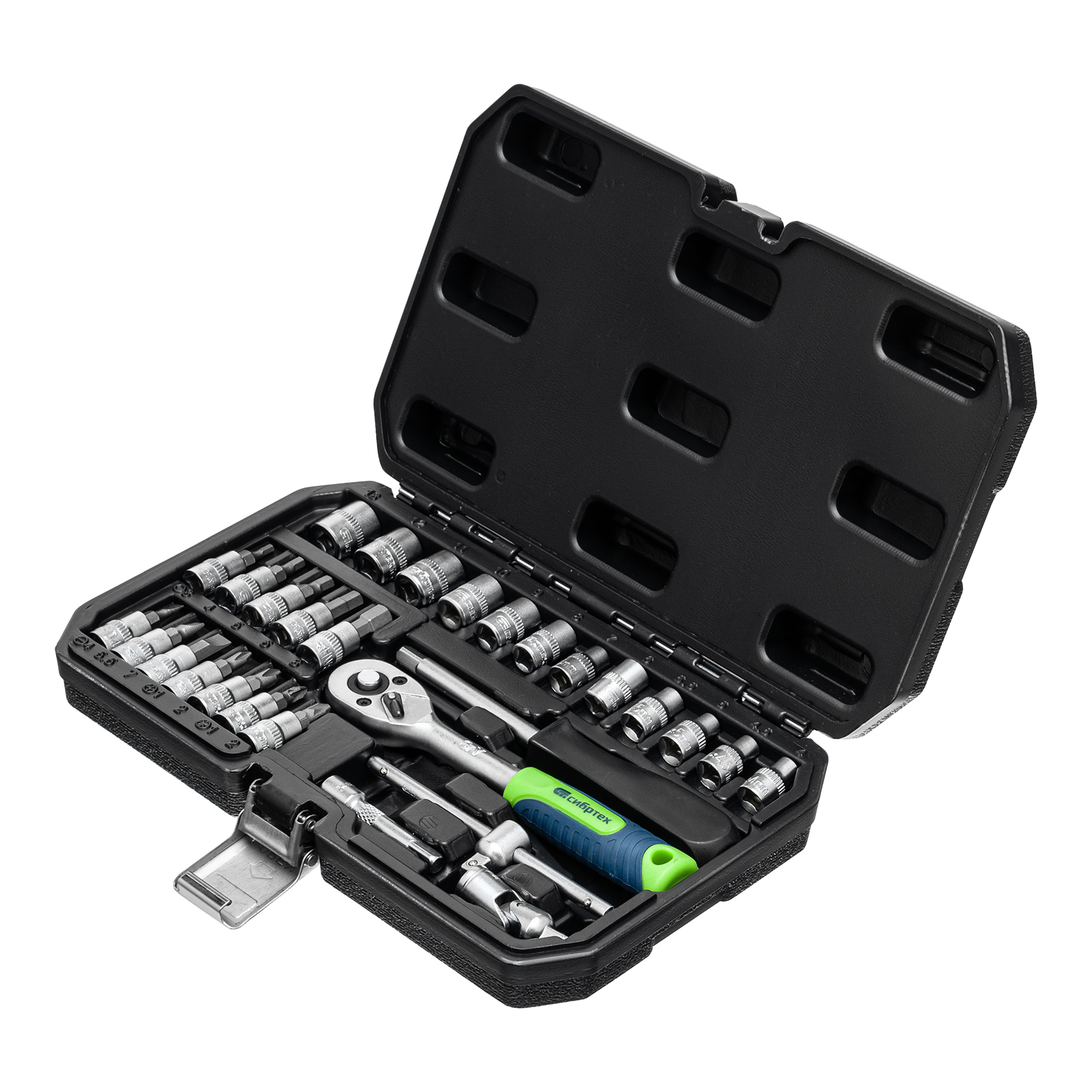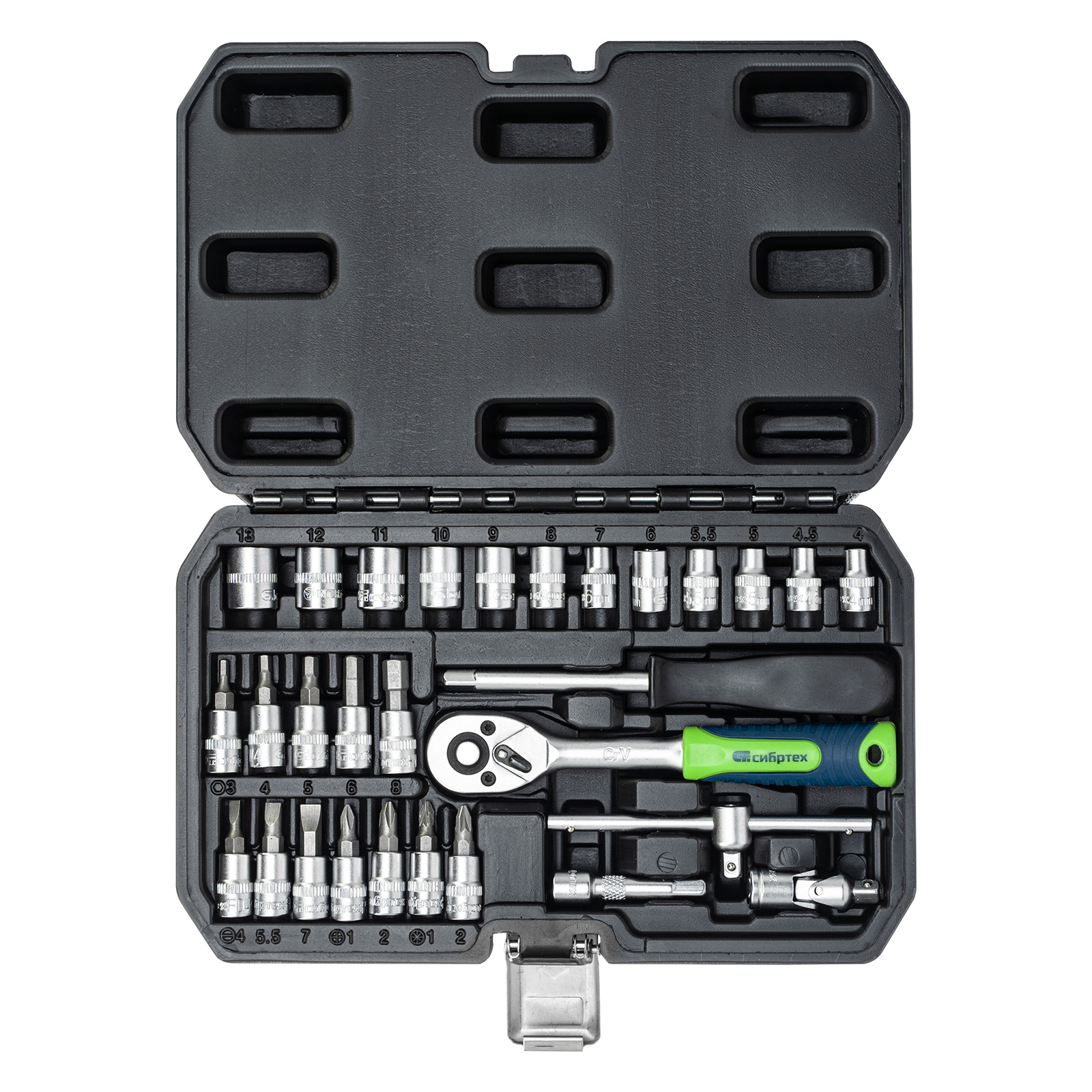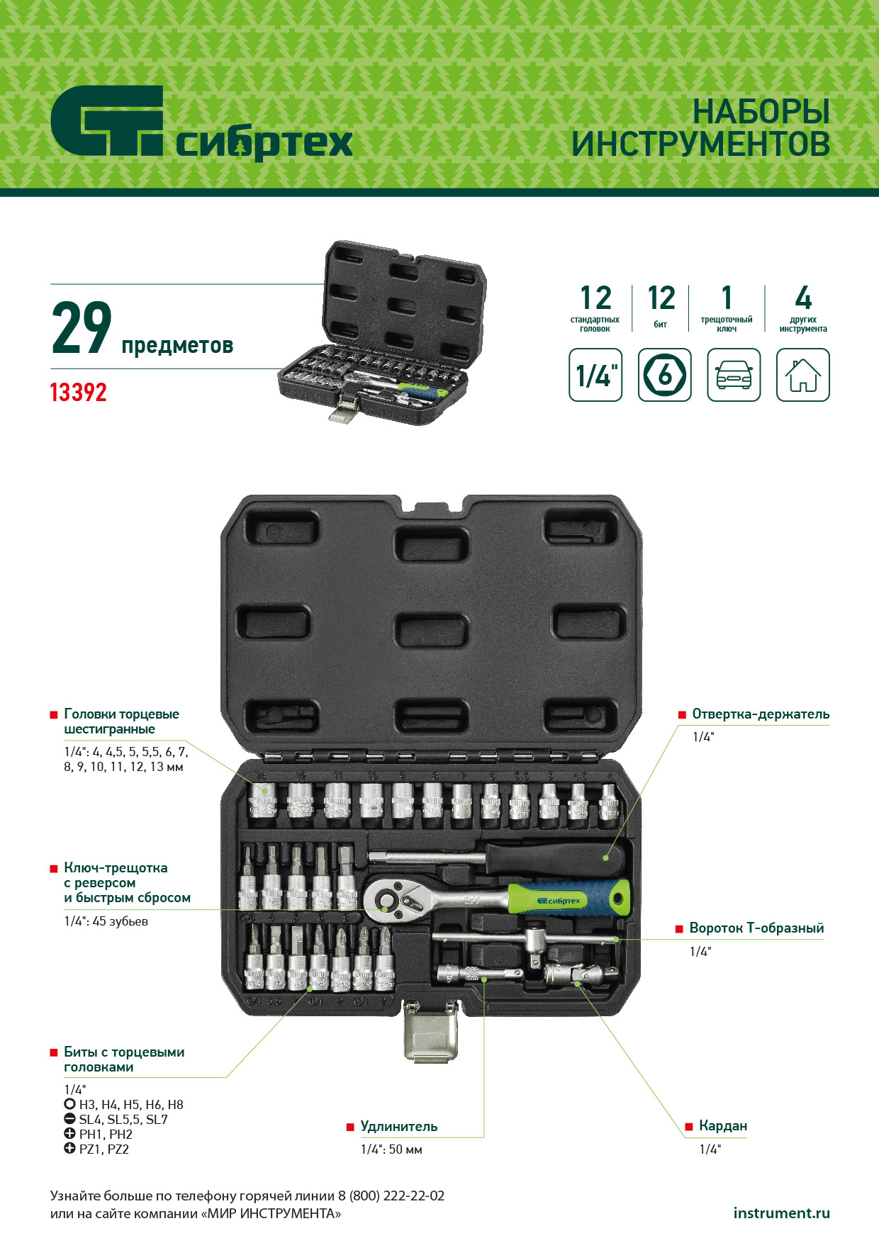 Набор инструментов Сибртех 13392, поставляющийся в пластиковом кейсе, состоит из 29 предметов с присоединительным размером 1/4"", предназначенных для работы с резьбовыми соединениями. В комплект поставки входят кардан, удлинитель и вороток, упрощающие работу в труднодоступных местах. Набор будет полезен автолюбителю и домашнему мастеру.