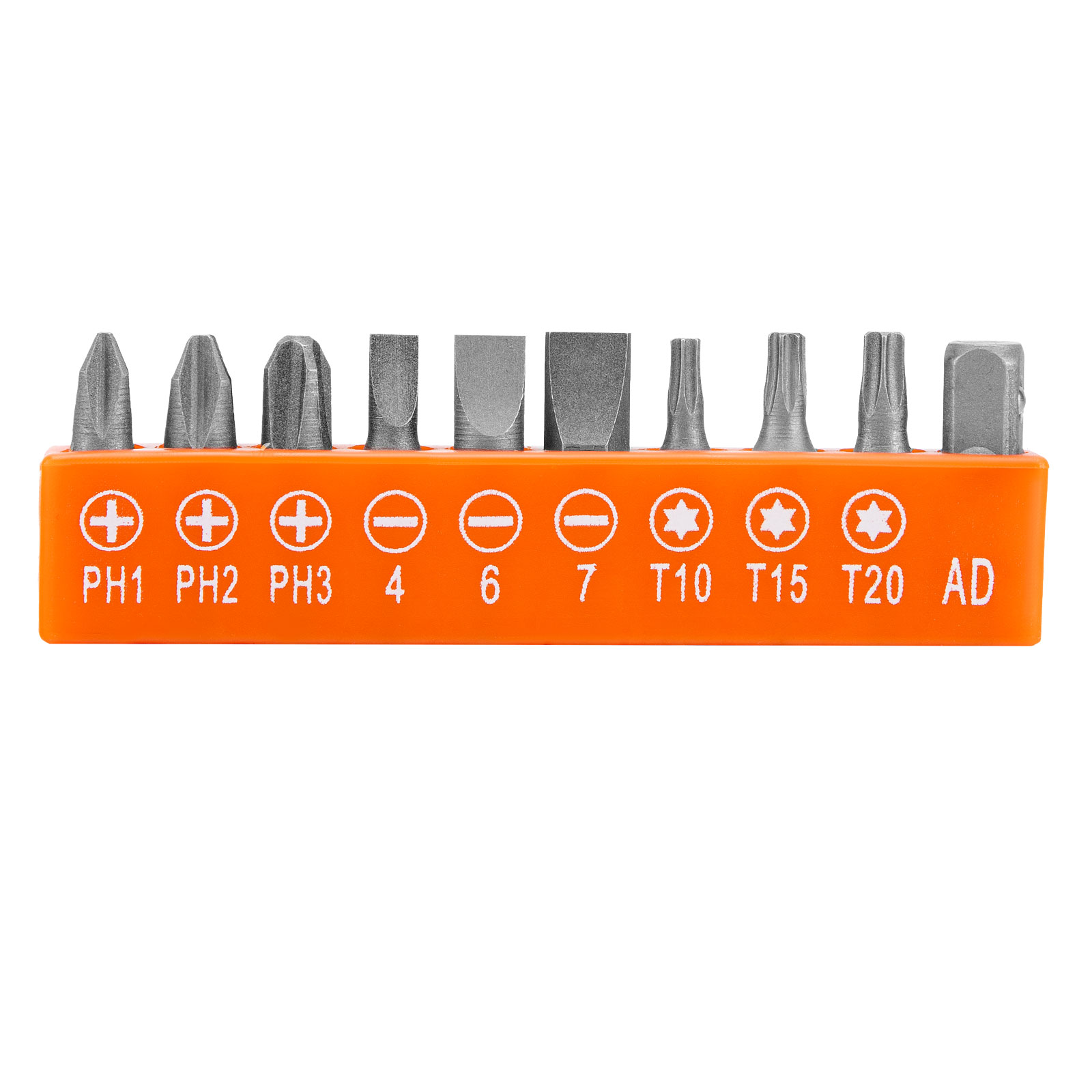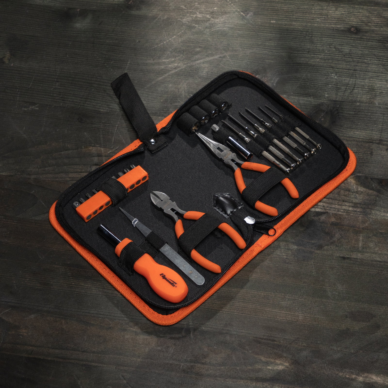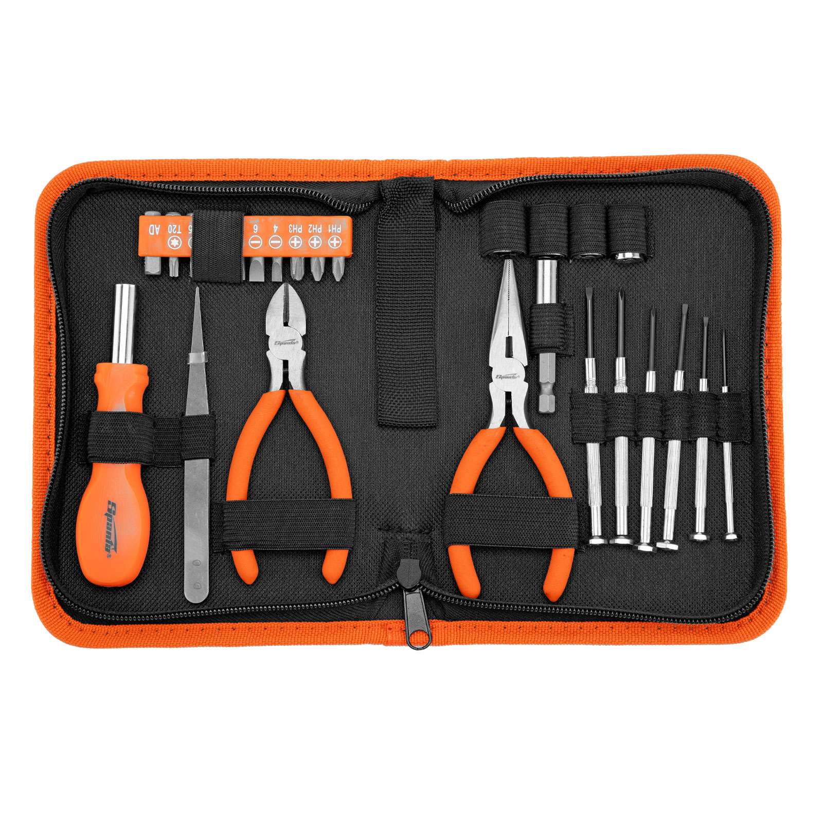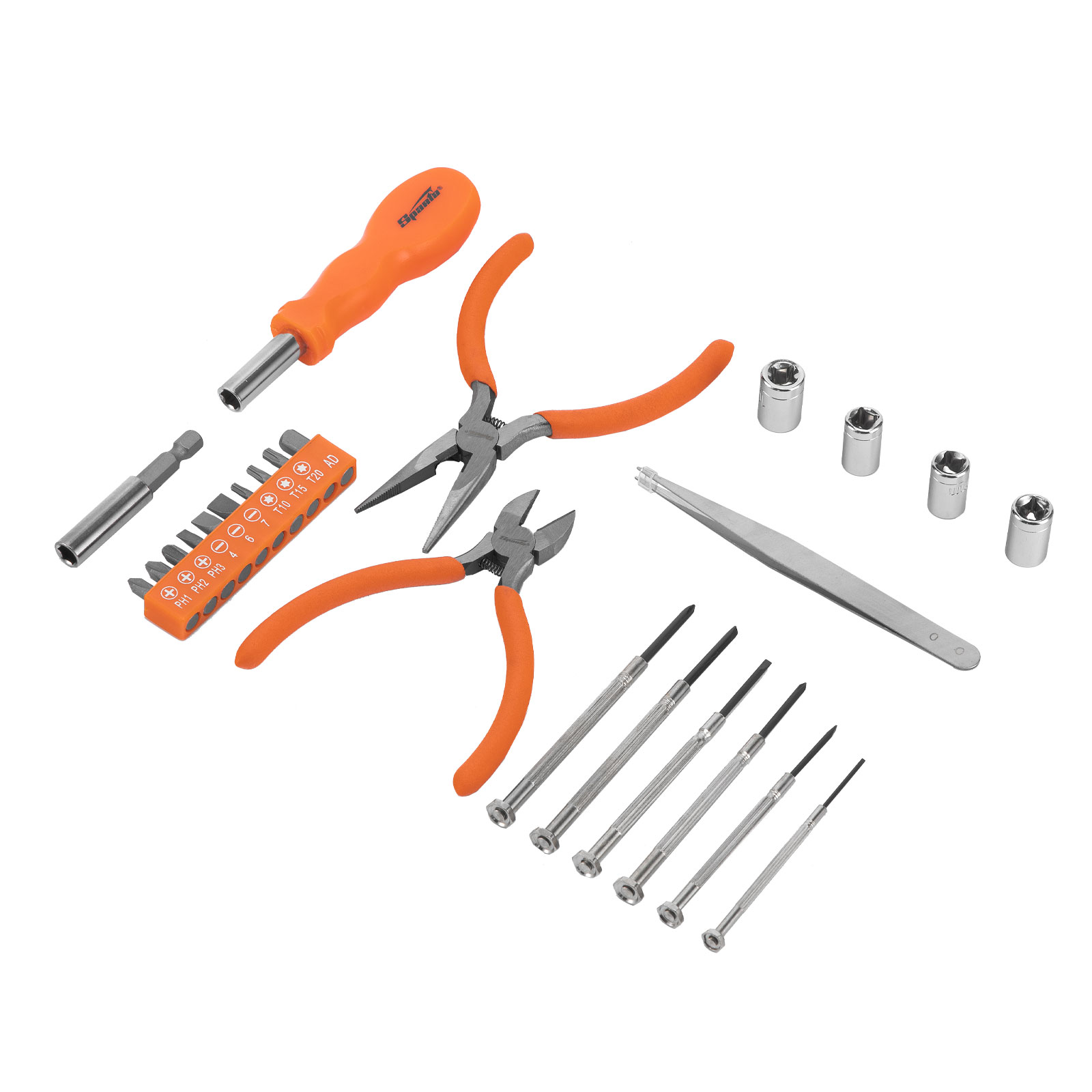Длинногубцы - 1 шт, Бокорезы - 1 шт, Головки 7, 8, 9, 10 - 4 шт, Отвертки для точных работ SL, PH - 6 шт, Отвертка для бит - 1 шт, Адаптер для бит - 1 шт, Биты PH, SL, T - 9 шт, Пинцет - 1 шт, Держатель для бит с магнитом - 1 шт, Кейс - 1 шт |