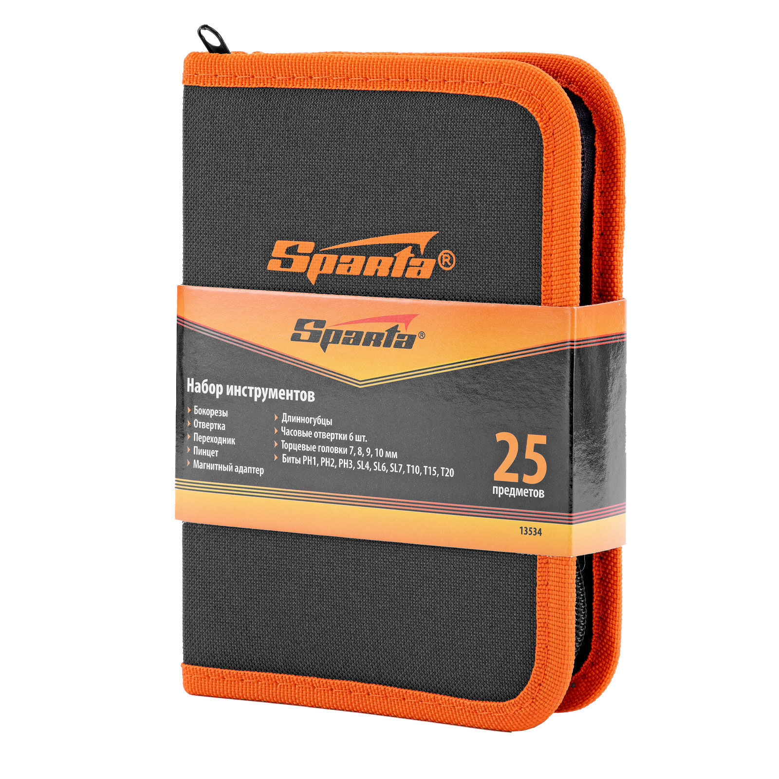 Набор Sparta 13534 включает 25 предметов, необходимых при проведении слесарно-монтажных работ. Он рассчитан на бытовое использование, поэтому будет полезен в хозяйстве. С помощью часовых отверток можно провести точные работы, биты и торцевые головки позволяют осуществить монтаж/демонтаж резьбовых соединений, вспомогательный инструмент пригодится для захвата и удержания деталей, удлинитель используется для работы в труднодоступных местах.