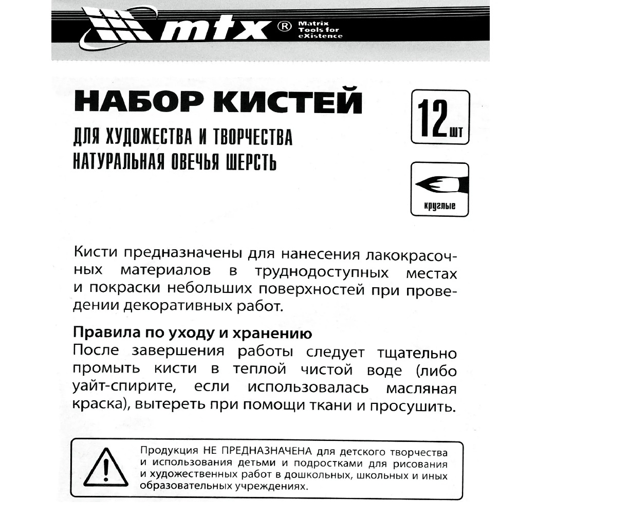 Набор из 12 круглых кистей MTX 84118 используется для занятий художеством и творчеством. Предназначен для выполнения тонких и деликатных работ, оптимален для окрашивания небольших поверхностей и нанесения лакокрасочных материалов в труднодоступных местах. Кисти разного размера позволяют успешно решать различные творческие задачи. Набор используется для декорирования мебели, покраски стен, а также для трафаретной росписи или для подкрашивания мелких элементов.