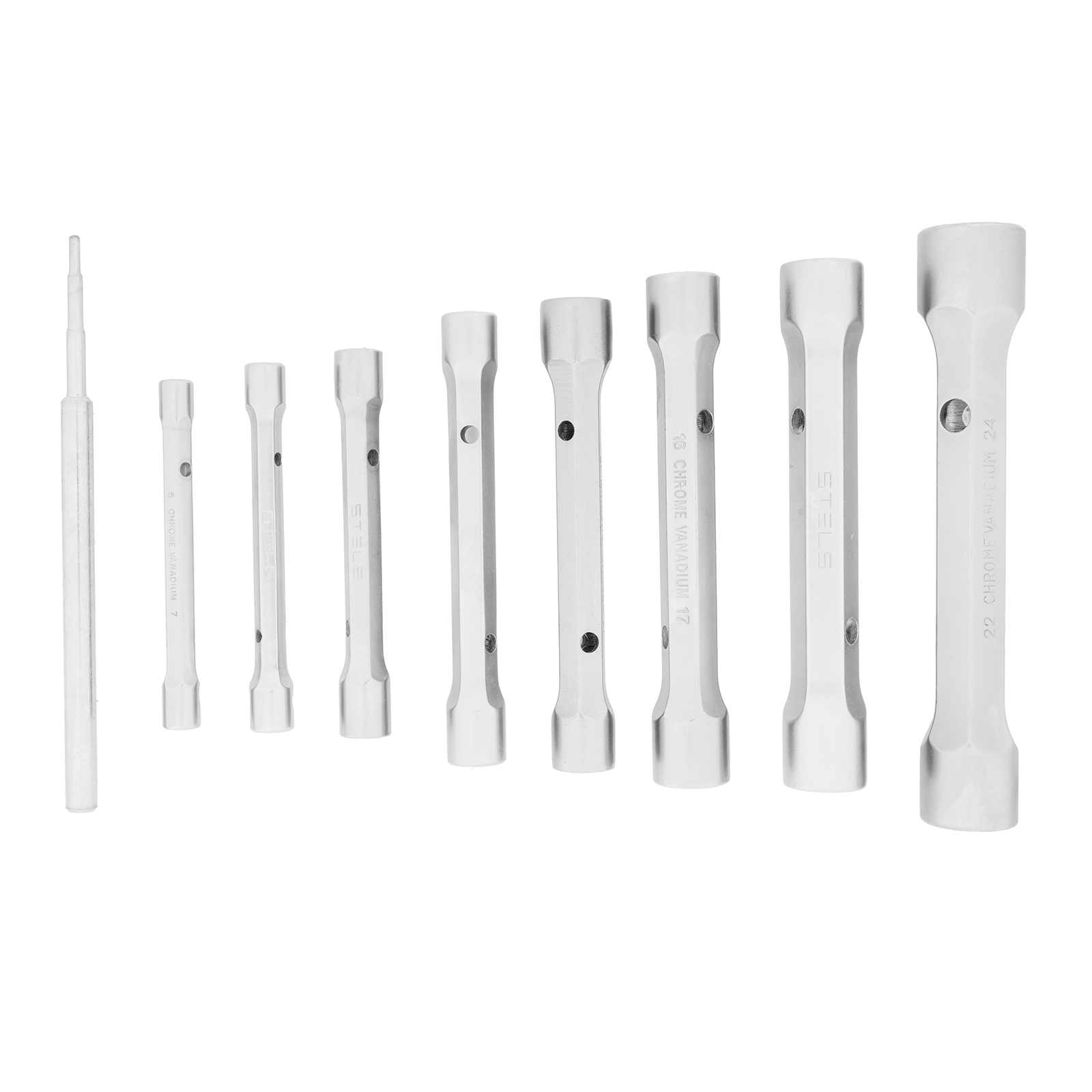 Набор Stels 13779 включает 9 предметов из стали CrV: 8 торцевых усиленных ключей-трубок и поворотный стержень. Ключи с двусторонним профилем основных размеров 6-24 мм рассчитаны на профессиональное применение. Подходят для монтажа/демонтажа болтовых соединений, шпилек и другого крепежа, требующего приложения значительных усилий. Продуманная форма ключей позволяет работать в труднодоступных местах.