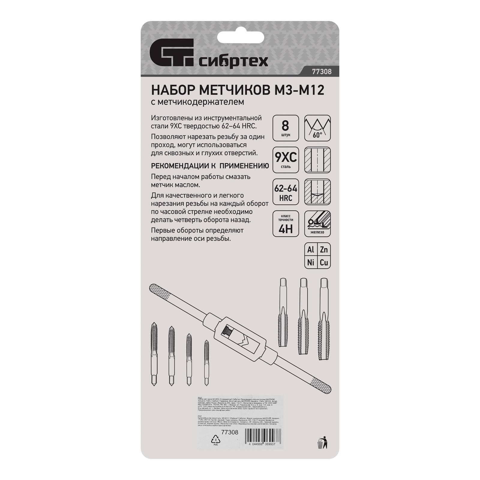 Набор метчиков М3-М12 Сибртех 77308 состоит из 8 предметов — метчикодержателя и метчиков, позволяющих вручную нарезать внутреннюю резьбу в сквозных и глухих отверстиях. Оптимален для работы с цветными металлами. Набор будет полезен при ремонте оборудования, автомобилей, а также пригодится в быту.