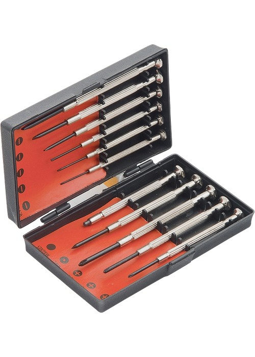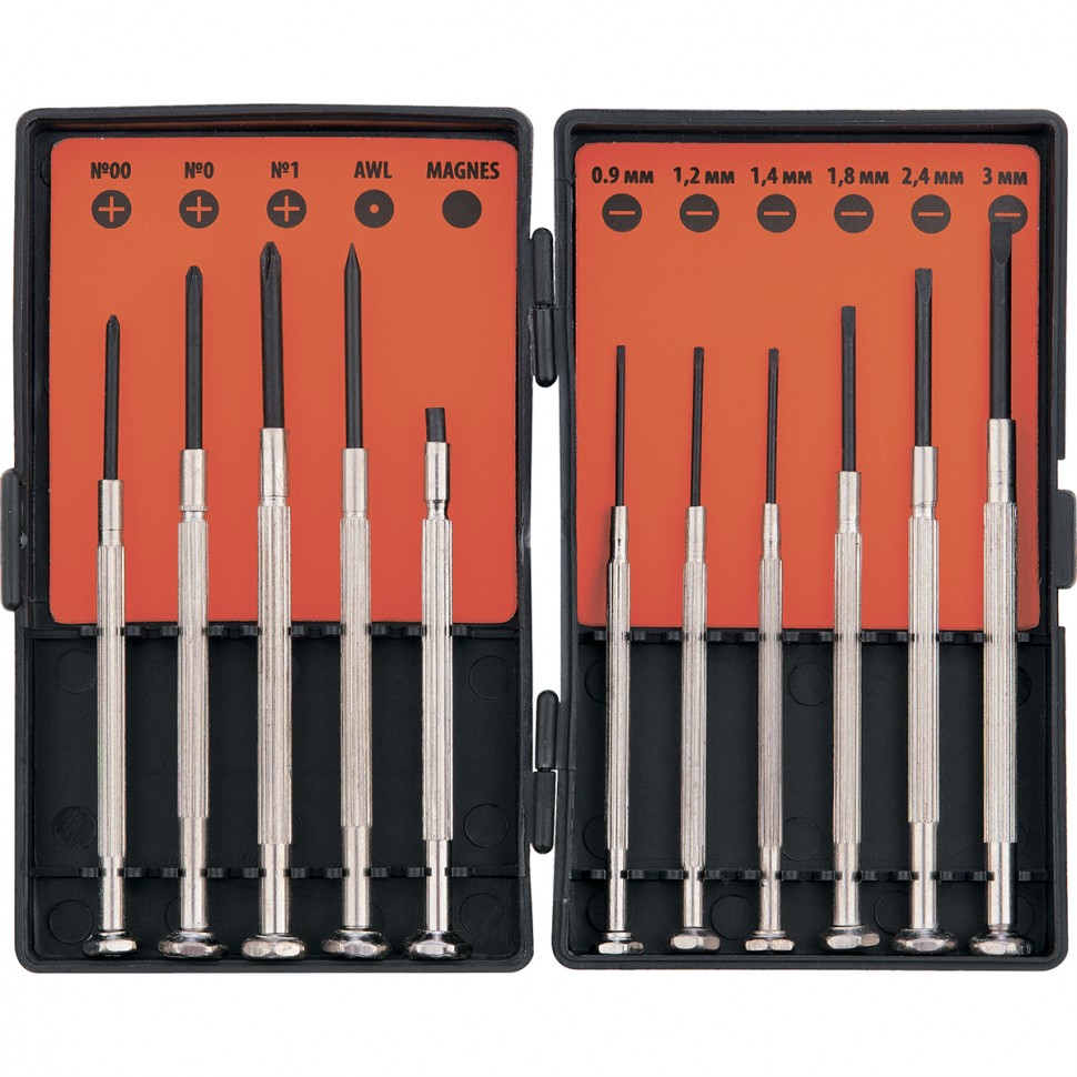 Набор отверток Sparta 133605, 11 предметов, используется для точной механики при осуществлении монтажа/демонтажа микровинтов со шлицами SL и PH. Он рассчитан на несложные бытовые работы, может применяться в частной мастерской. С помощью набора легко ремонтировать мелкие бытовые приборы, очки, часы и т.д.