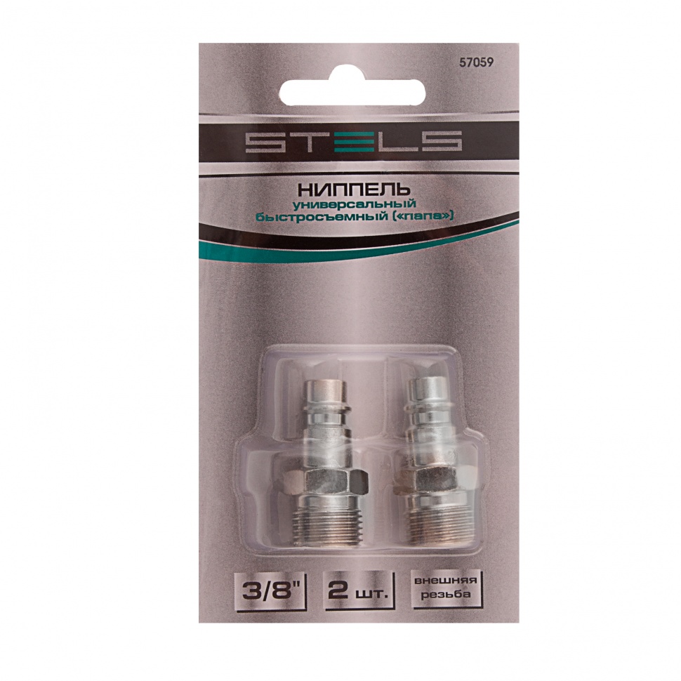 Универсальный быстросъемный ниппель Stels 57059, 2 шт. в упаковке, предназначен для перехода с внешней резьбы 3/8 дюйма на рапид типа «папа» для соединения пневматического шланга и компрессора. Используется для работы с пневмоинструментом, будет полезен на строительной площадке, в гараже и автосервисе.