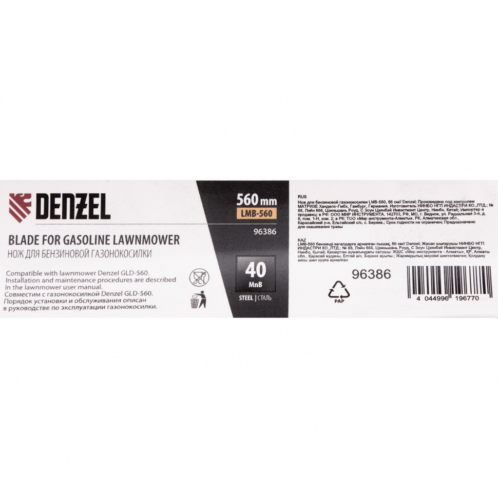 Нож Denzel 96386 длиной 56 см — сменный режущий элемент для бензиновой газонокосилки LMB-560. Используется для кошения травы на дачных газонах, кортах, а также для ухода за садовыми и парковыми территориями. Эффективно срезает траву, пригодится владельцам дачных участков и работникам коммунальных служб.