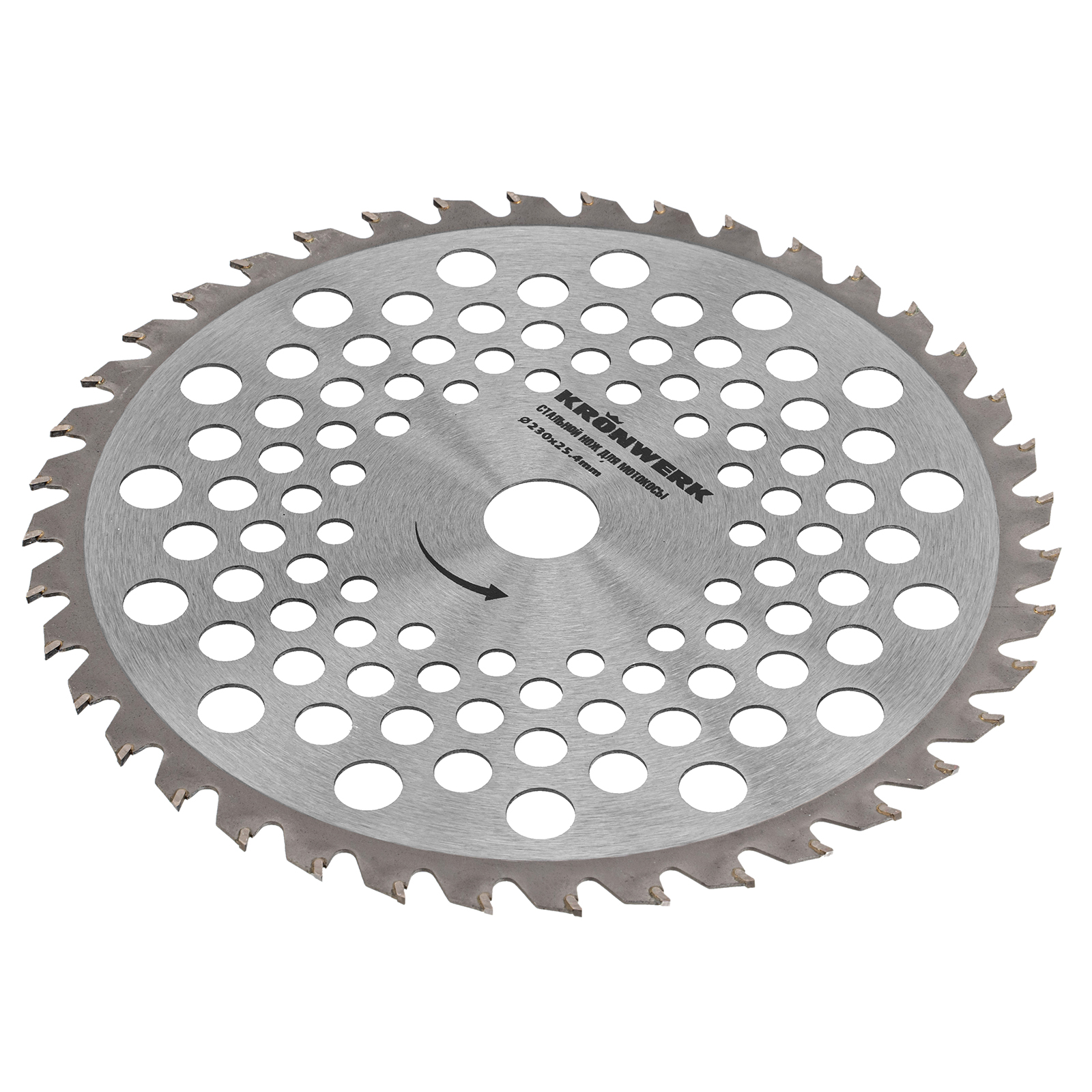 Нож для триммера Kronwerk 96343 размером 230 х 25,4 мм, толщиной 1,3 мм, с 40 зубьями, предназначен для скашивания травы всех типов, в том числе травы с толстыми жесткими древовидными стеблями (полыни, крапивы, лебеды, борщевика), а также кустарника и молодых побегов деревьев с диаметром стволов до 10 мм.