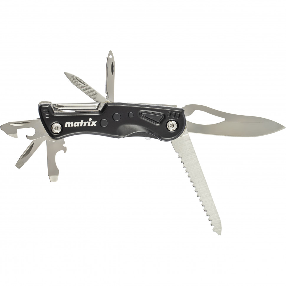 Многофункциональный нож Matrix 17625 длиной 107 мм, выполняющий 11 функций и поставляющийся с чехлом, — универсальный инструмент, который будет полезен дома, на даче и в гараже, а также в поездке, походе, на пикнике, рыбалке или охоте. Ножом можно резать различные материалы и продукты, пилой — срезать тонкие ветки, а шилом — проделывать отверстия. Открывалки удобно использовать для банок. Пилка для ногтей пригодится в быту.