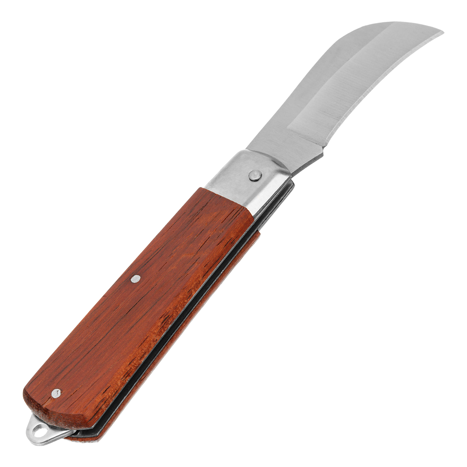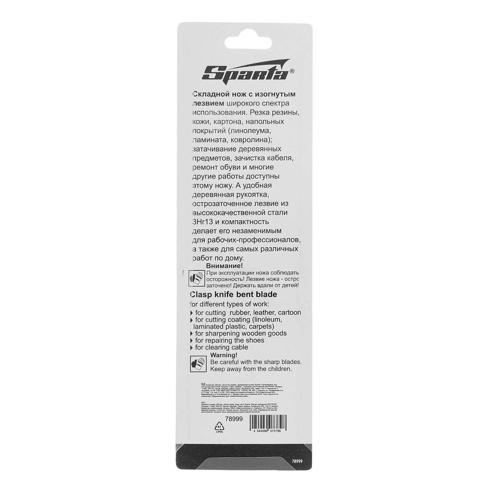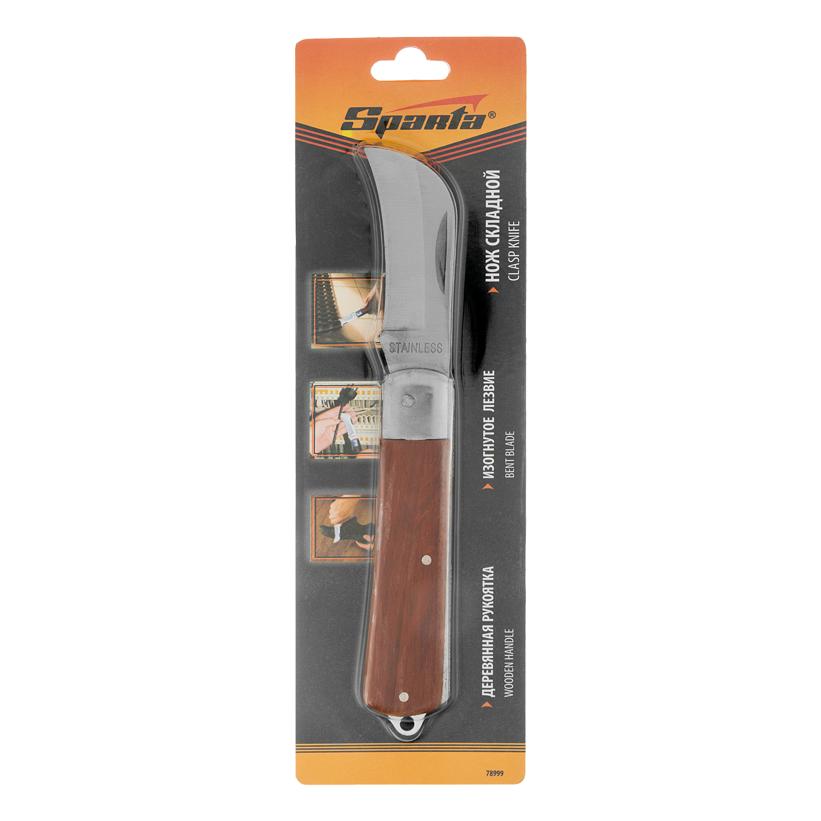 Складной нож Sparta 78999 с загнутым лезвием и деревянной ручкой эффективно справляется с резкой резиновых, кожаных, картонных изделий и напольных покрытий. За счет своей универсальности он будет полезен профессиональным и частным мастерам, туристам, любителям отдыха на природе.