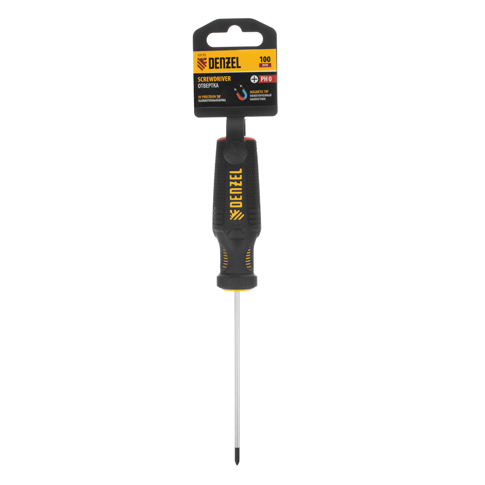 Отвертка PH0 х 100 мм Denzel 12172 из стали CrV, с трехкомпонентной рукояткой, предназначена для закручивания и откручивания резьбовых крепежей типа Philips. Шлиц намагничен, что избавляет от необходимости придерживать винт или саморез рукой. Отвертка рекомендована для профессионального использования.
