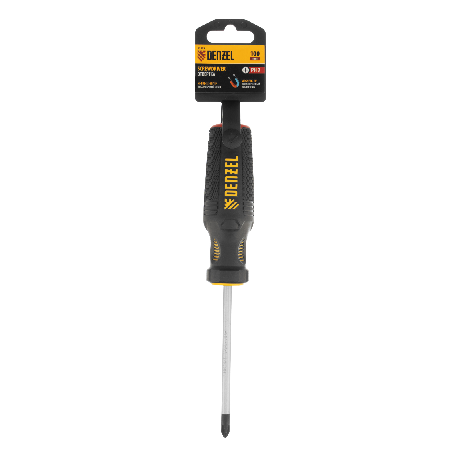 Отвертка PH2 х 100 мм Denzel 12178 из стали CrV, с трехкомпонентной рукояткой, предназначена для закручивания и откручивания резьбовых крепежей типа Philips. Шлиц намагничен, что избавляет от необходимости придерживать винт или саморез рукой. Отвертка рекомендована для профессионального использования.