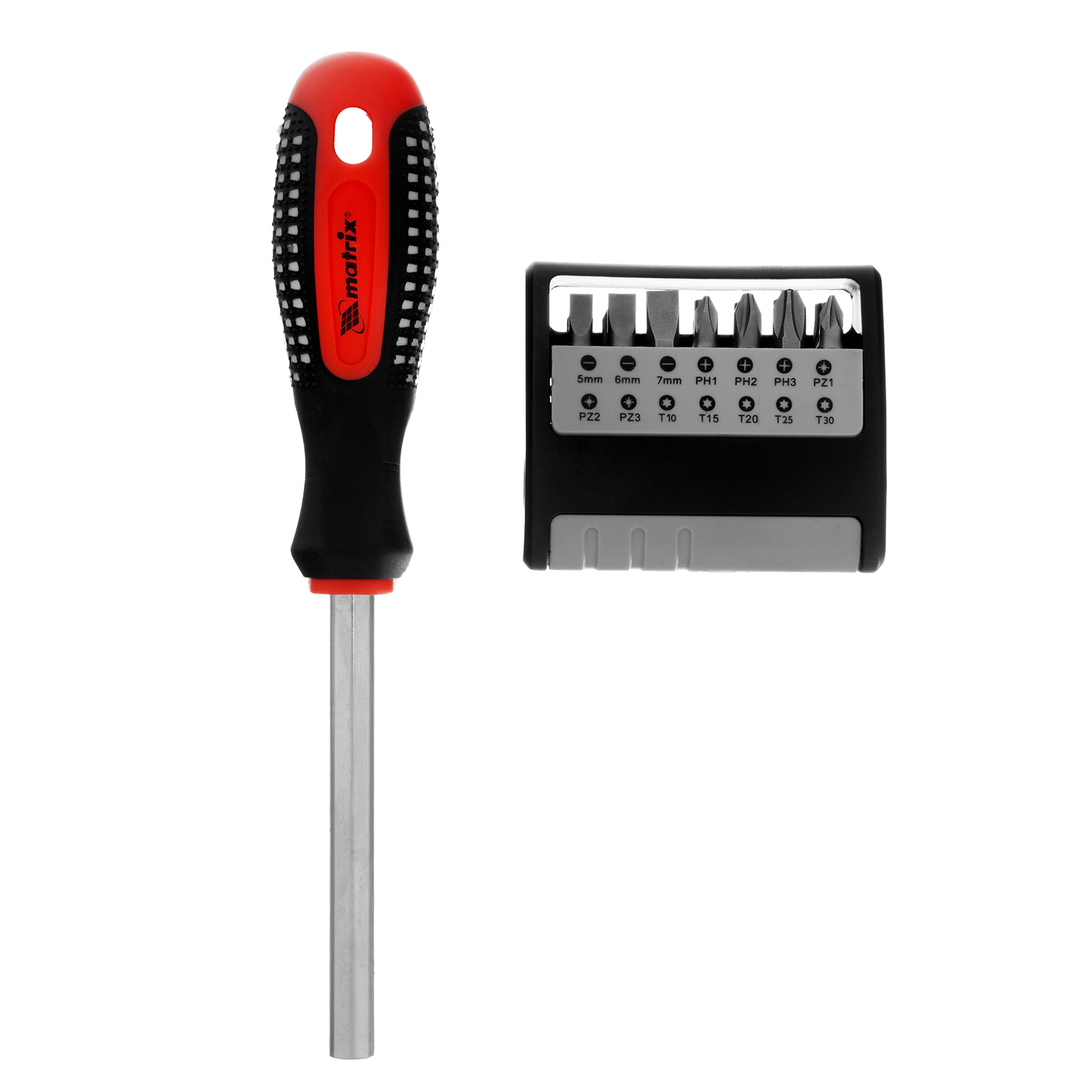Отвертка Matrix 11337 с набором из 14 бит из стали CrV служит для откручивания и закручивания резьбового крепежа со шлицами SL, PH, PZ и Torx. Заменяет комплект стандартных отверток. Присоединительный шестигранник с магнитом надежно удерживает биту, не давая ей выскочить во время работы. Набор подходит для профессионального и бытового применения.