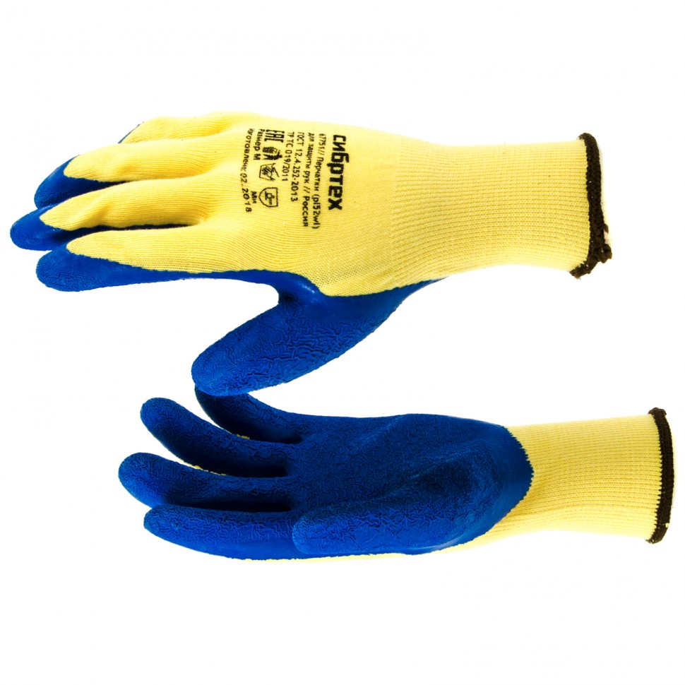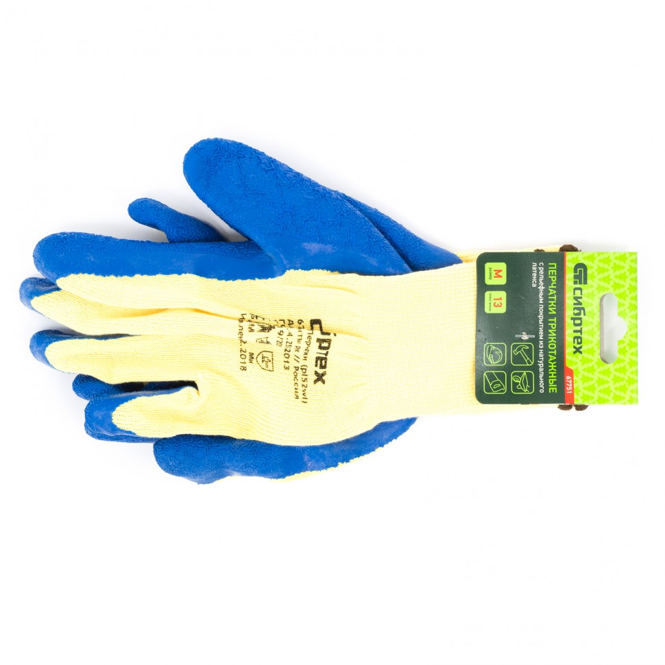 Трикотажные полиэфирные перчатки Сибртех 67751 размера M, с латексным рельефным покрытием, предохраняют пальцы и ладони от порезов, царапин, ссадин и мозолей, а также препятствуют попаданию влаги и загрязнению. Поскольку тактильная чувствительность пальцев сохраняется, в перчатках удобно работать с мелкими деталями. Изделия используются во время строительства и хозяйственной деятельности.