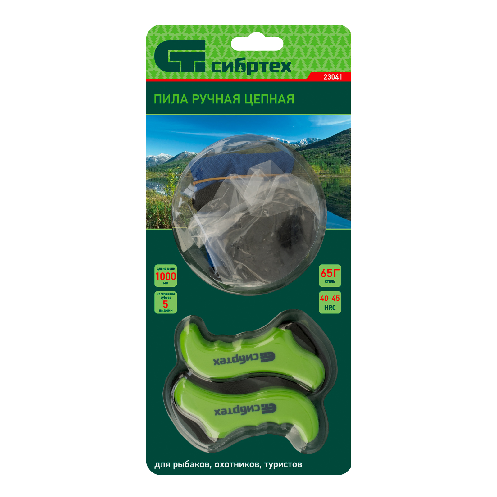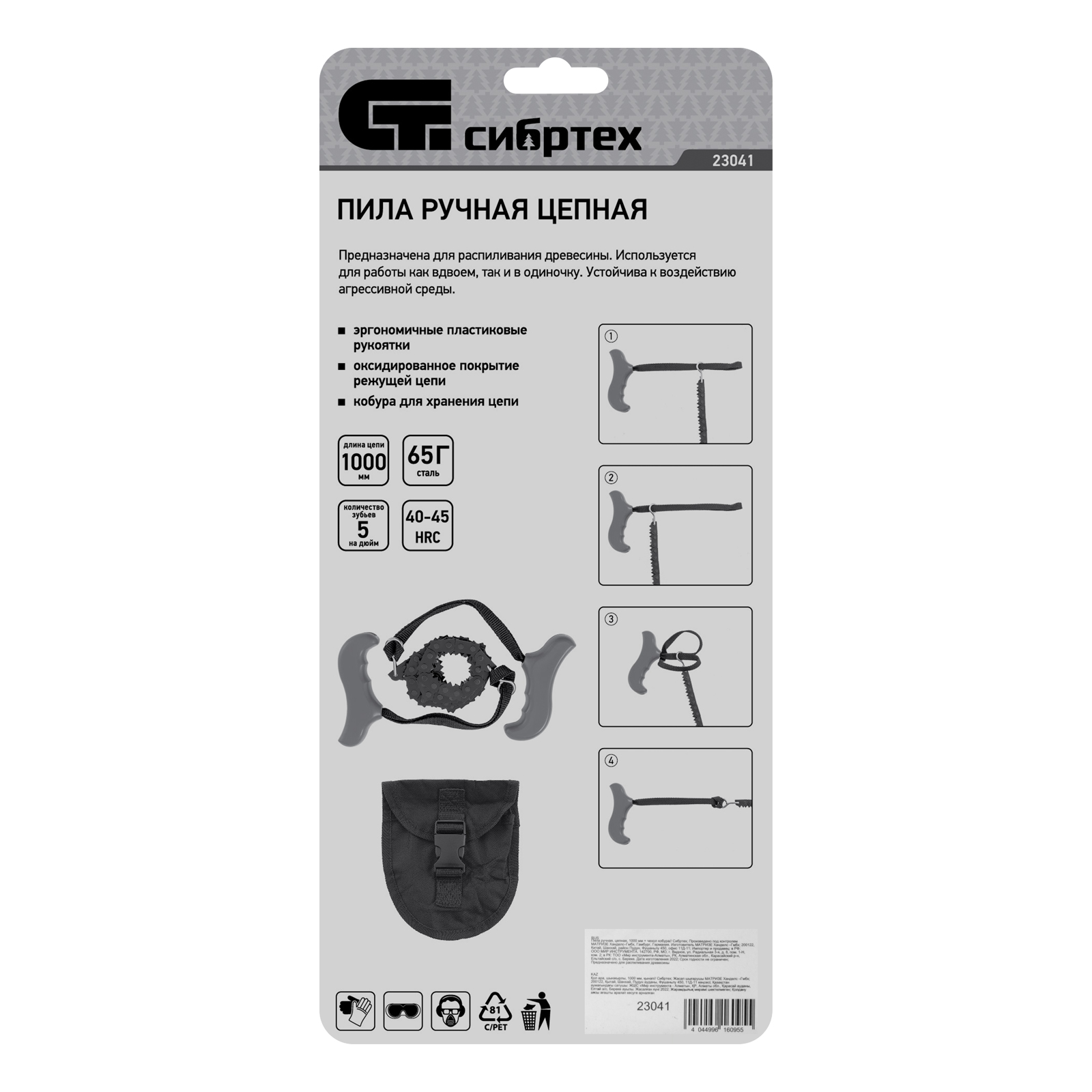 Пила ручная цепная Сибртех 23041 длиной 1000 м, с чехлом-кобурой, предназначена для поперечного распиливания древесины. Шаг зубьев составляет 5 TPI, что обеспечивает высокую скорость работы. Рукоятки надежно прикреплены к крюкам ремешками из полиэстера. Инструмент пригодится на дачном участке, в поездке, походе или на рыбалке, может использоваться для заготовки дров.