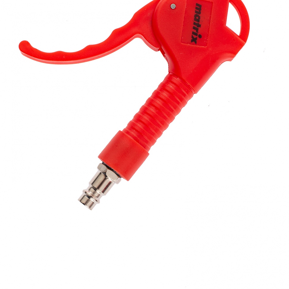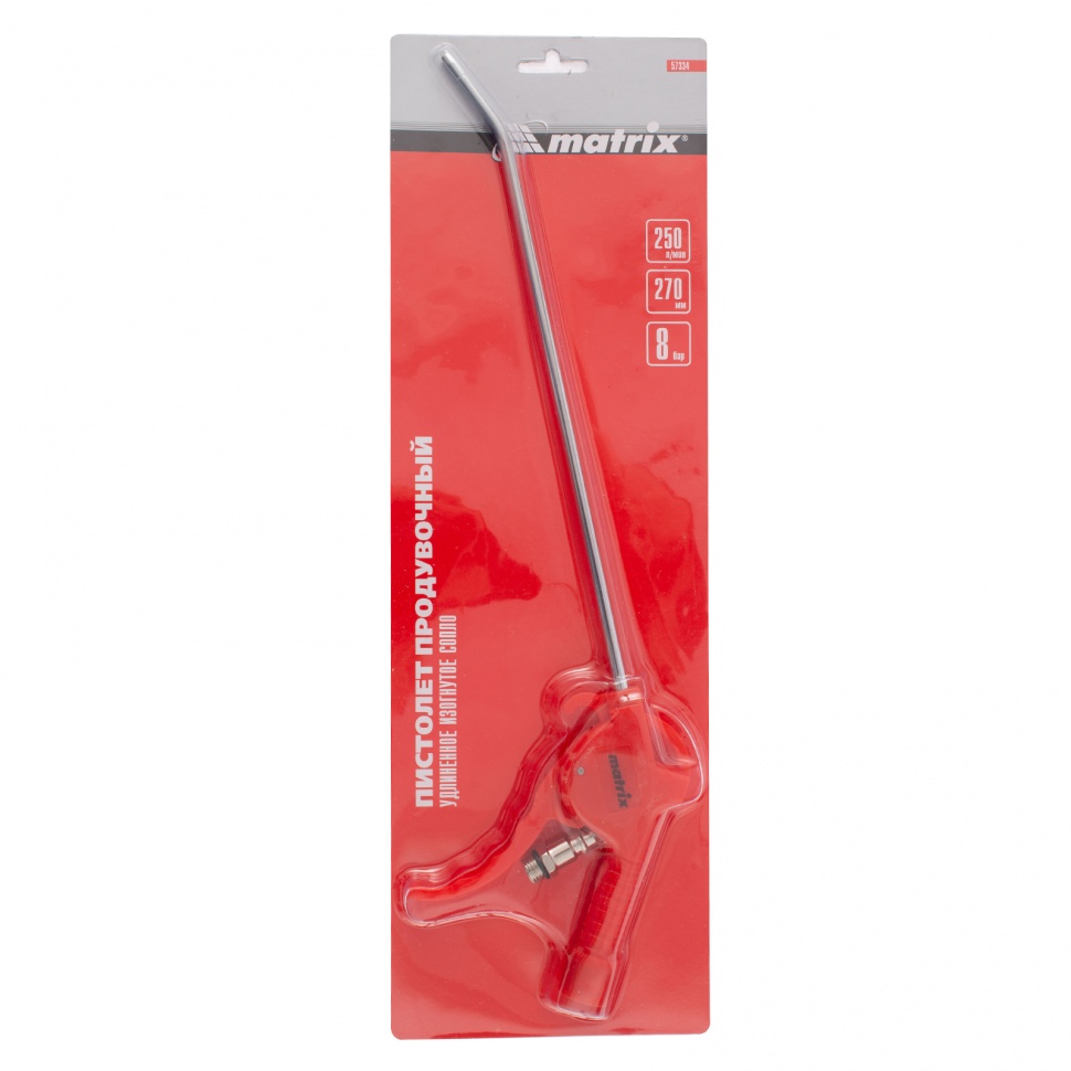 Пистолет продувочный Matrix 57334 с удлиненным изогнутым соплом длиной 270 мм подходит для применения в быту, в автосервисах, в небольших мастерских и на строительных объектах. С помощью потока сжатого до 8 бар воздуха эффективно очищает отверстия, шланги, пазы деталей и поверхности с производительностью до 270 л/час. Продувочный пистолет отличается высоким уровнем пожарной безопасности, поэтому может использоваться во влажных помещениях.