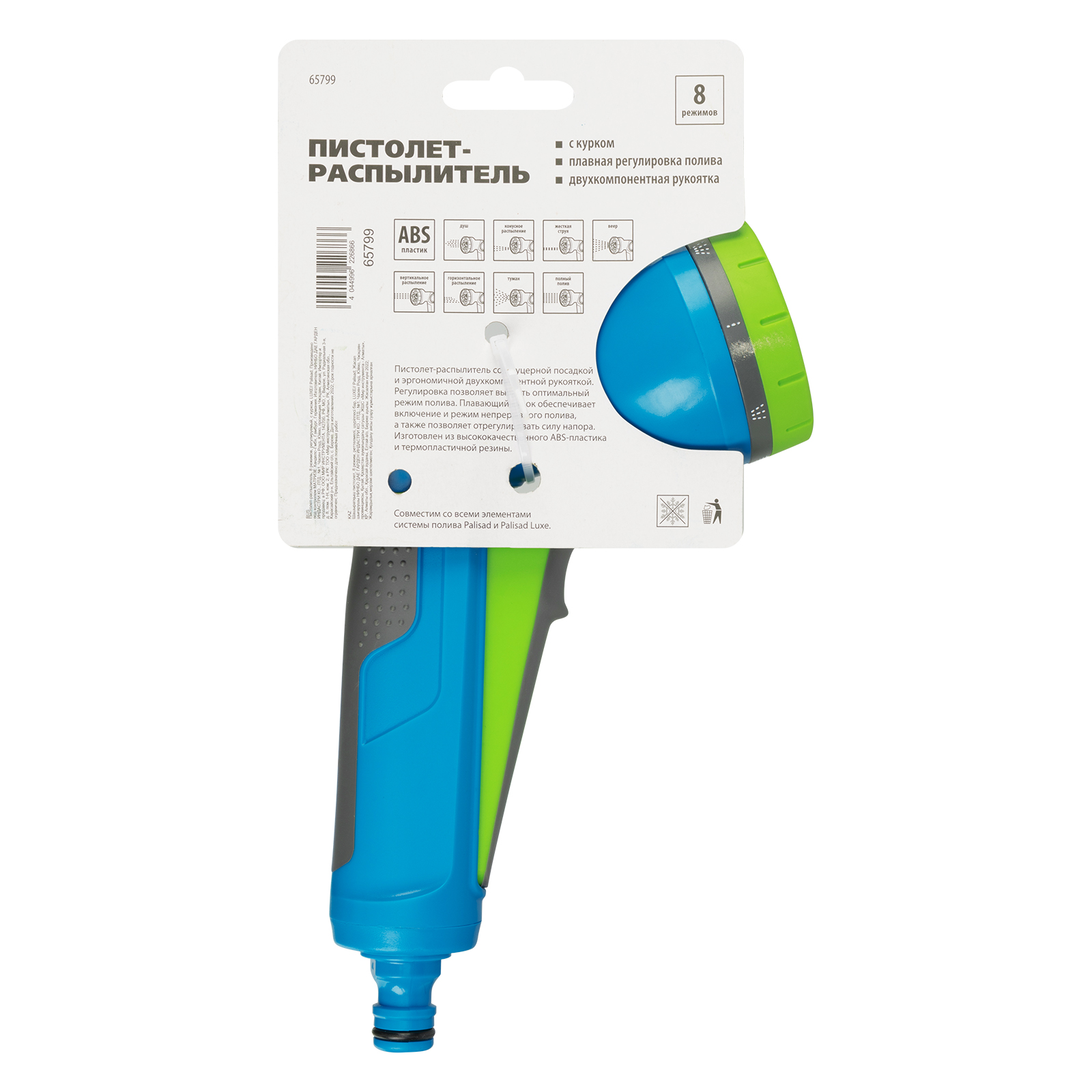 Регулируемый пистолет-распылитель Palisad LUXE 65799 с курком и 8 режимами работы подключается к любым поливочным системам ТМ Palisad и Palisad Luxe для ручного орошения растений на участке, в сквере или парке, а также мытья дорожек и садовых принадлежностей. 8 режимов распыления позволяют выбрать необходимый тип струи для полива различных растений. Пистолет будет полезен садоводам и сотрудникам коммунальных служб.