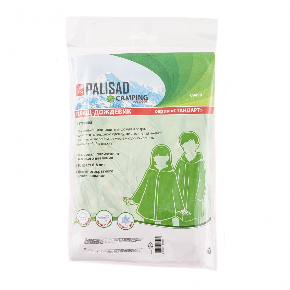 Детский плащ-дождевик Palisad Camping серии «Стандарт» 69498, микс цветов, эффективно защищает от дождя, ветра и снега. Рассчитан на рост от 116 до 134 см и возраст от 6 до 8 лет. Надевается на верхнюю одежду и не сковывает движения, имеет капюшон для защиты головы. Представлен в голубом, желтом, зеленом и красном цветах, хорошо различимых в условиях плохой видимости. Пригодится во время городской прогулки, а также в лесу, на пикнике или рыбалке.
