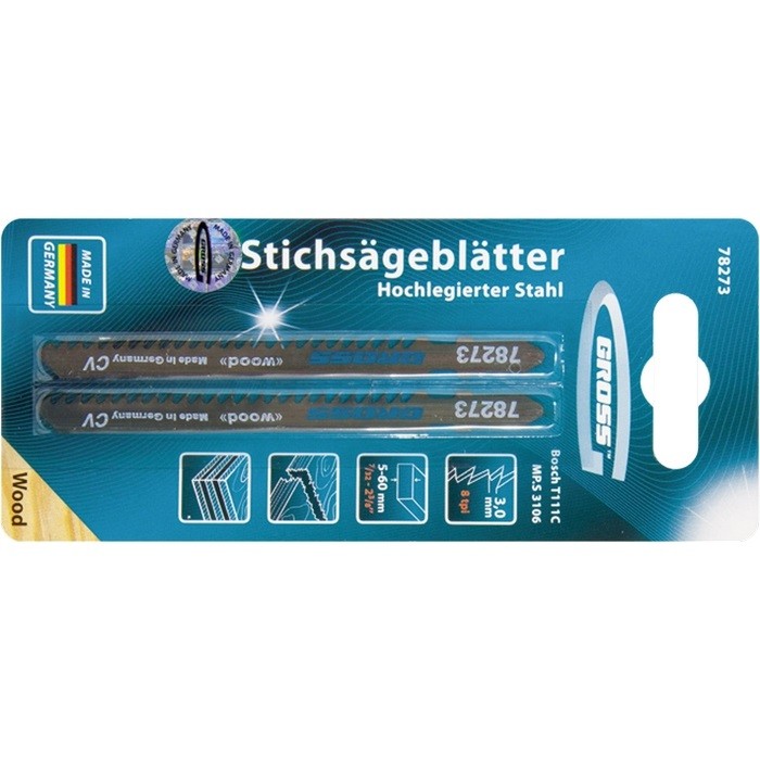 Полотна для электролобзика по дереву Gross 78273, 2 шт. (3106 - T111C), используются для работы с древесиной, ДСП, ДВП, МДФ, композитных материалов на основе древесины и т.д. Они рассчитаны на профессиональное применение и пригодятся при проведении строительных и ремонтных работ. За счет длины 100 мм и толщины 1,25 мм полотна способны распилить заготовки толщиной 5-60 мм.