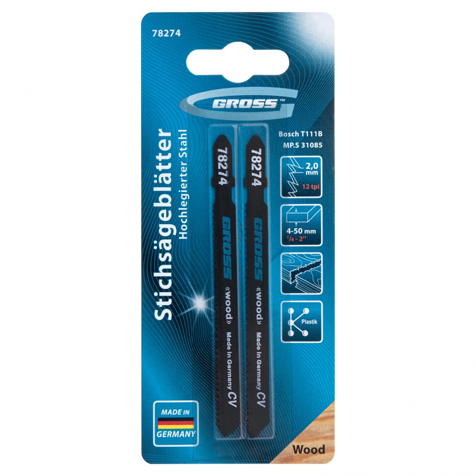Полотна для электролобзика по дереву Gross 78274, 2 шт. (31085 - T111B), используются для работы с древесиной мягких и твердых пород, ДСП, ДВП и композитных материалов на основе древесины. Они рассчитаны на профессиональное применение, пригодятся при проведении строительных и ремонтных работ. За счет рабочей длины 75 мм и толщины 1 мм полотна способны распилить заготовки толщиной 4-50 мм.