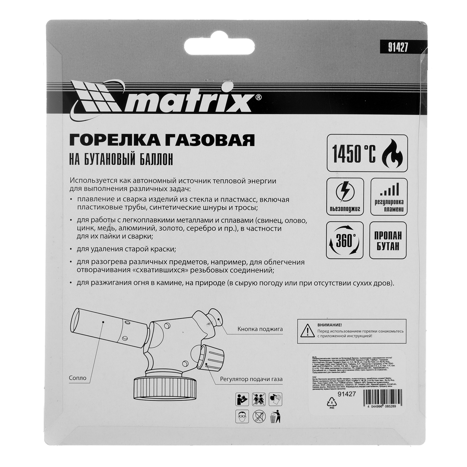 Горелка на бутановый баллон Matrix 91427 с пьезоподжигом и расширенным соплом, предназначена для профессионального использования и применяется для нагрева и пайки деталей. Будет полезна в автомастерской, а также дома, на даче или в походе. Температура пламени достигает 1450 градусов, что позволяет эффективно решать поставленные задачи.
