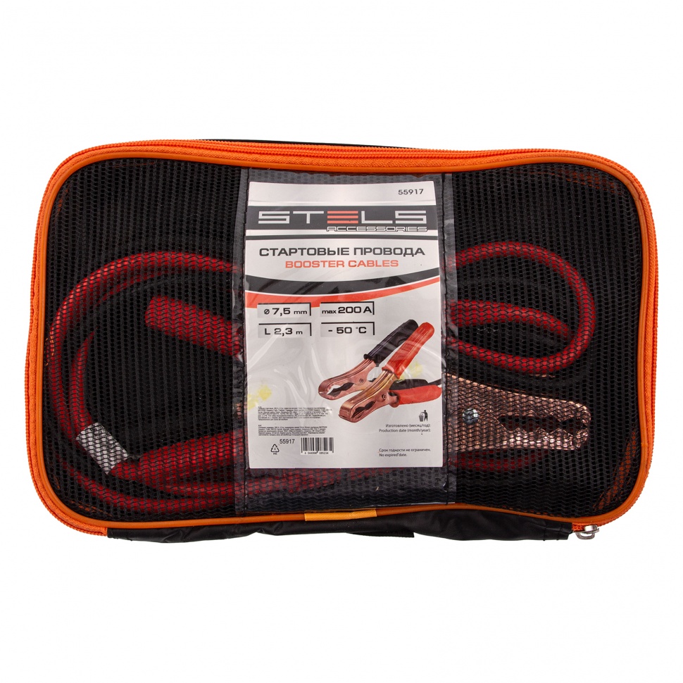 Стартовые провода Stels 55917 длиной 2,3 м, в сумке на молнии, рассчитаны на силу тока 200 А используются для «прикуривания» легковых и грузовых автомобилей, аккумуляторы которых разрядились по причине низкой окружающей температуры или длительного хранения. Допустимой силы тока 200 A достаточно для запуска стартеров большинства автомашин. Провода пригодятся автовладельцам