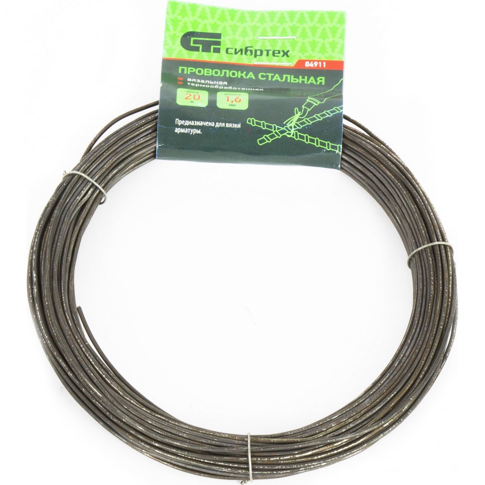 Стальная проволока Сибртех 84911 длиной 20 м и диаметром 1,6 мм, термообработанная, используется в качестве строительного материала при возведении железобетонных конструкций. Пригодится для вязки арматуры и решения хозяйственных нужд.
