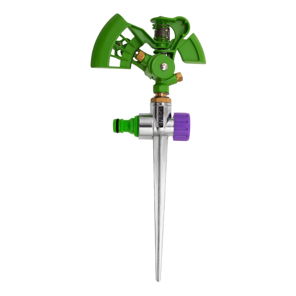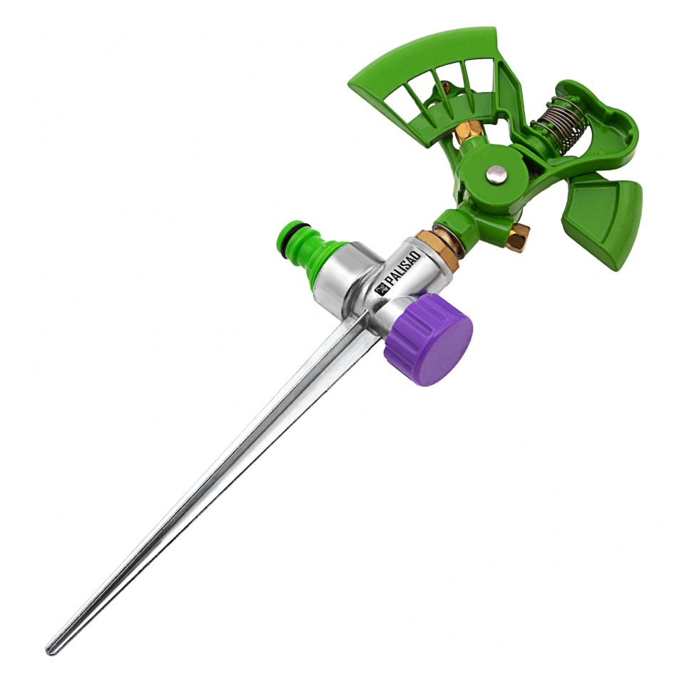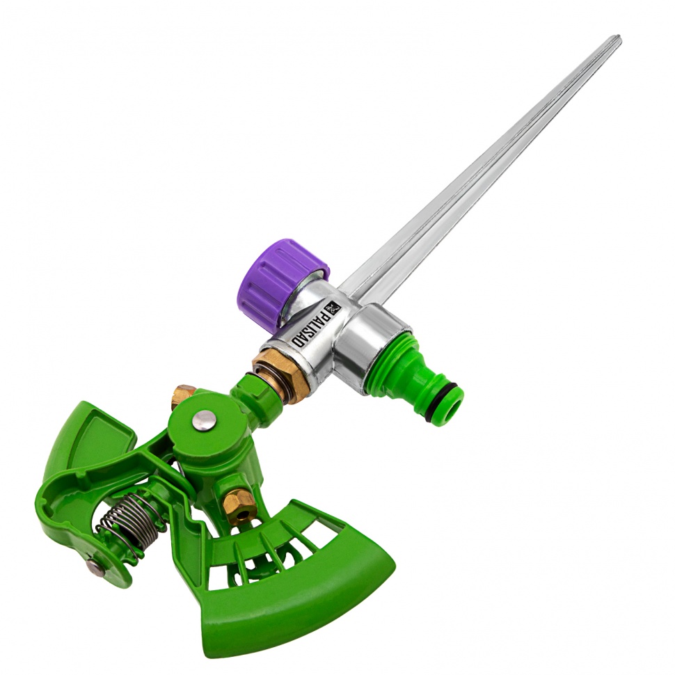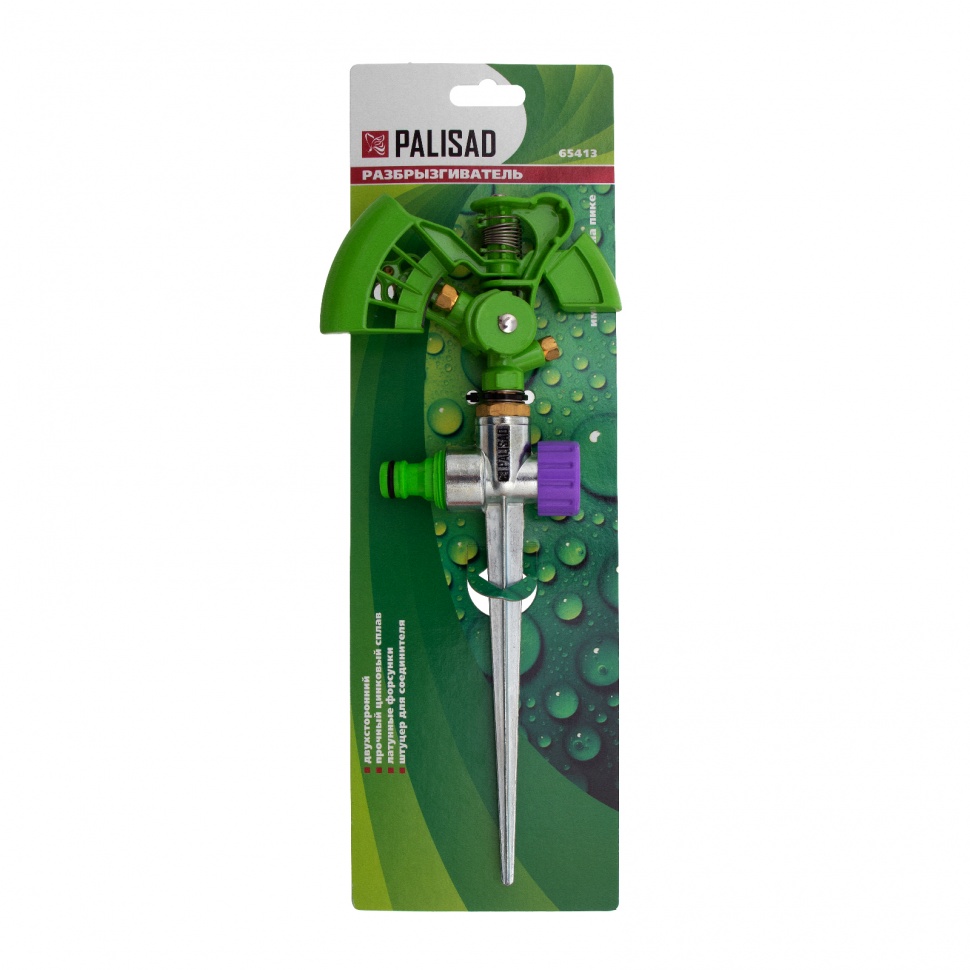 Импульсный металлический двухсторонний разбрызгиватель Palisad 65413 используется для кругового полива. Максимальная орошаемая площадь составляет 500 кв.м. Дальность распыления можно регулировать в диапазоне 8-13 м. Устройство предназначено для автоматического полива растений на озелененных территориях — садовых участках, в скверах и парках.