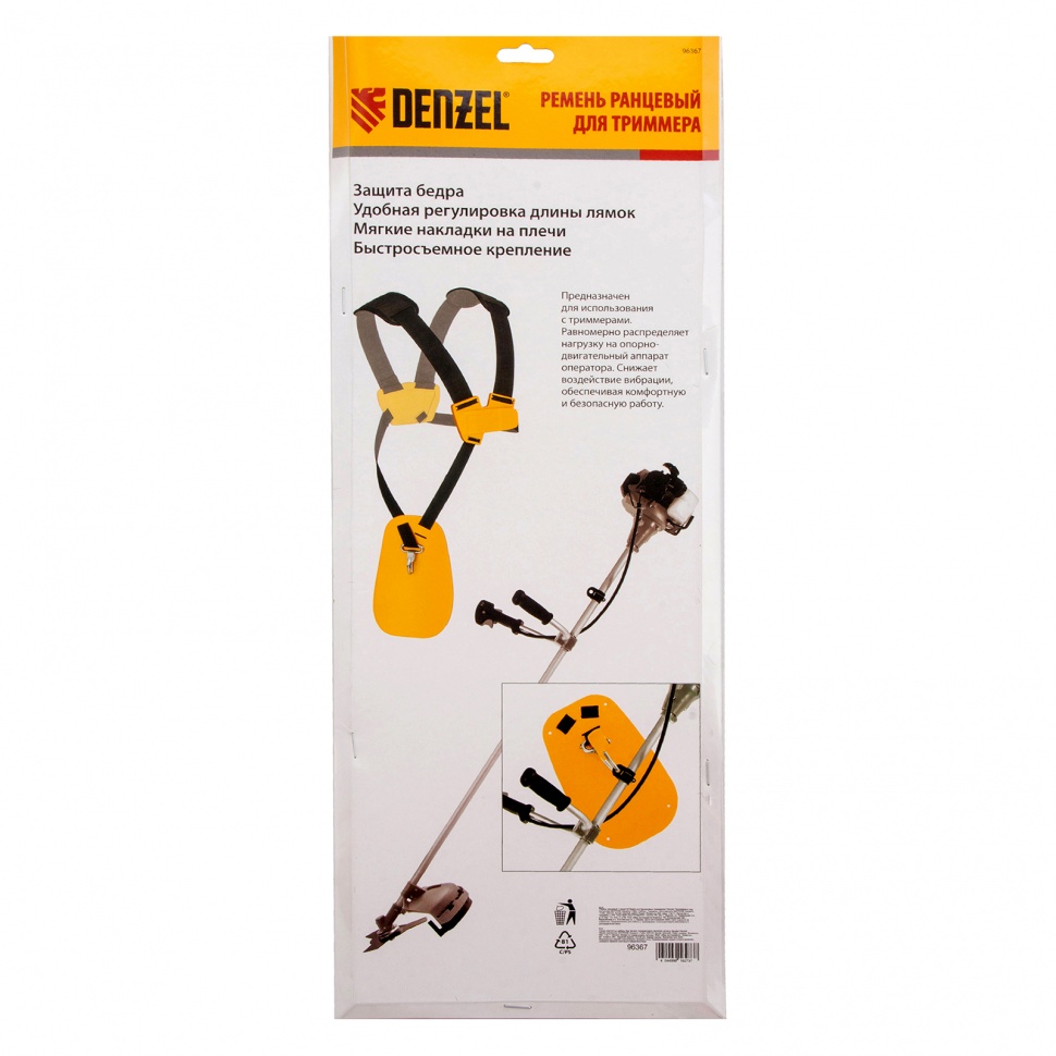 Ранцевый ремень Denzel 96367 с защитой бедра используется с бензиновыми триммерами Denzel. Двухплечевая подвесная система равномерно распределяет вес инструмента, снижая нагрузку на спину, поэтому она подходит для профессиональных работ на участках большой площади.