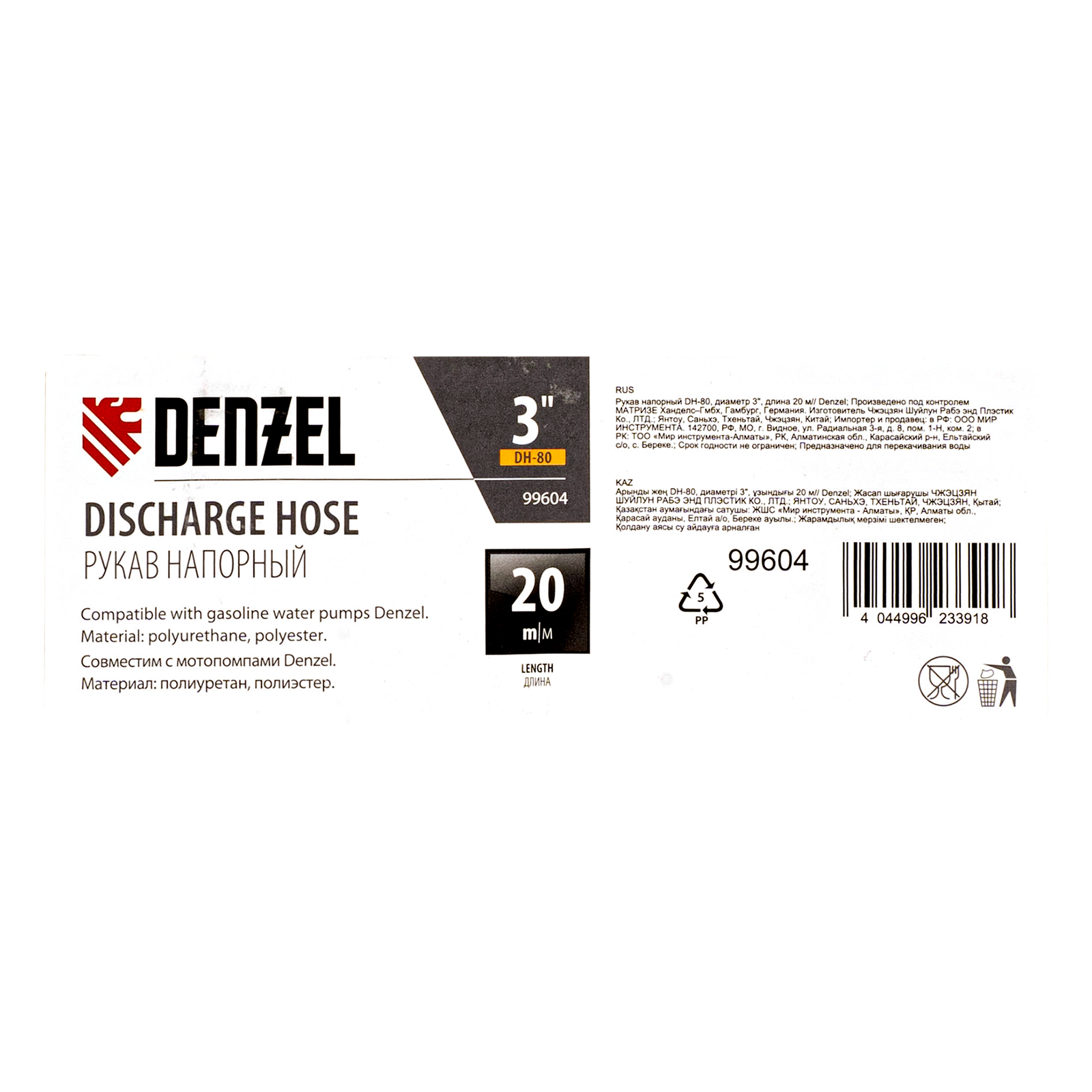 Напорный рукав Denzel DH-80 99604 диаметром 3" и длиной 20 м выдерживает рабочее давление 1 МПа и предназначен для подачи воды от мотопомпы к месту водоразбора или тушения пожара. Совместим с мотопомпами Denzel 99202 и 99204.