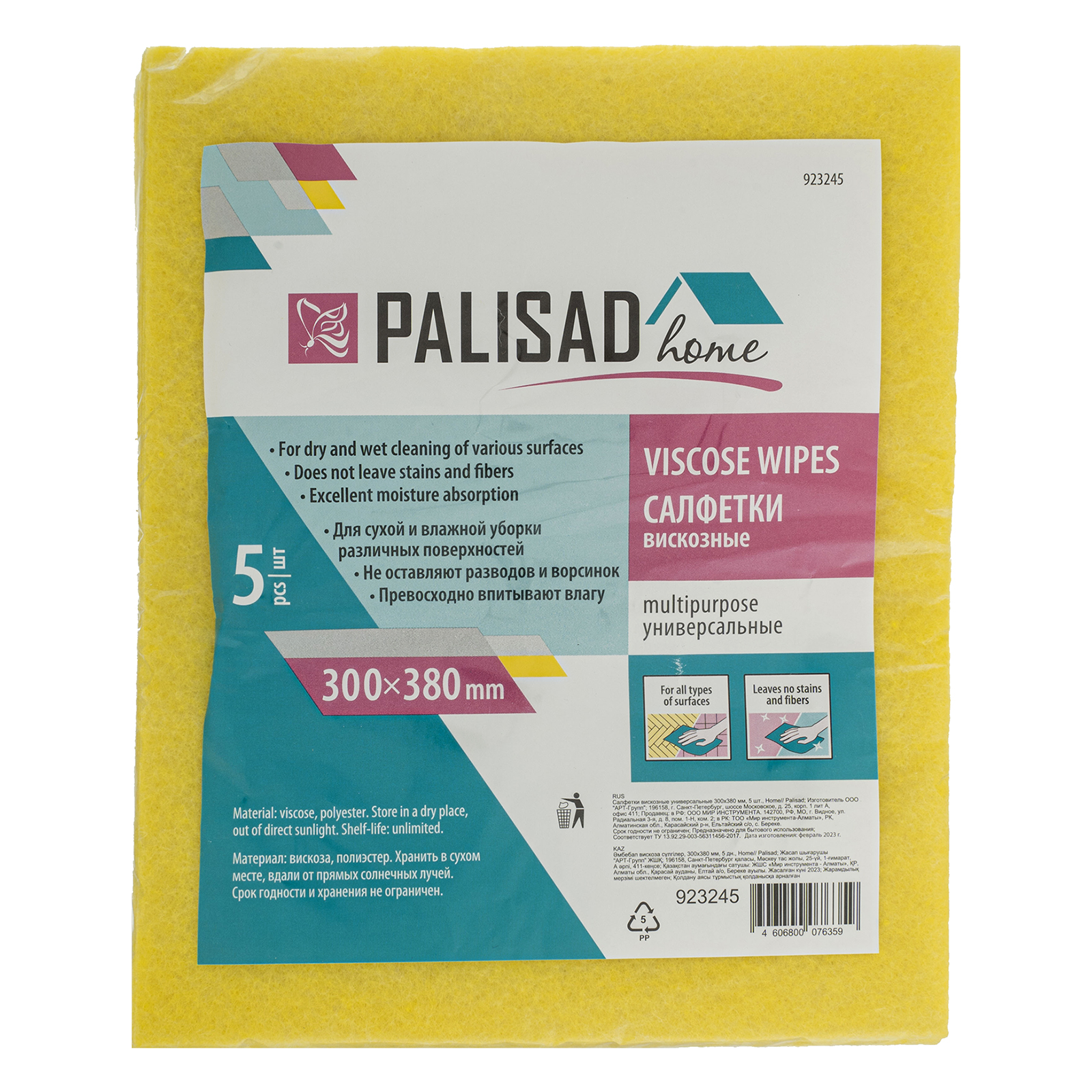 Универсальные вискозные салфетки Palisad Home 923245 размером 300 х 380 мм, 5 шт. в комплекте, подходят для уборки любых поверхностей, в том числе деликатных: зеркал, мебели, сантехники и т.д. Они гораздо дешевле микрофибры, но при этом также не оставляют следов и ворсинок.