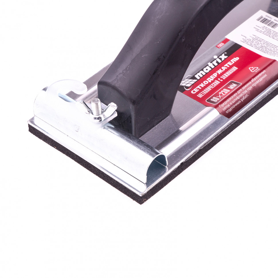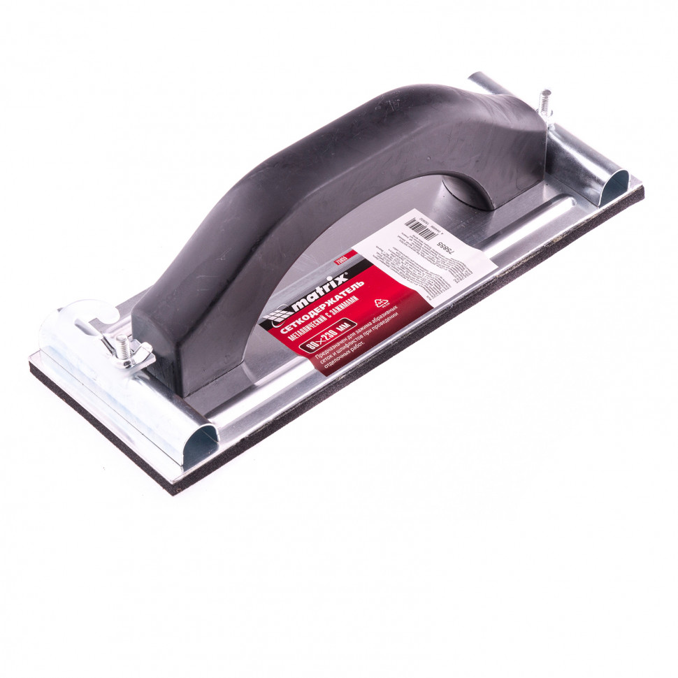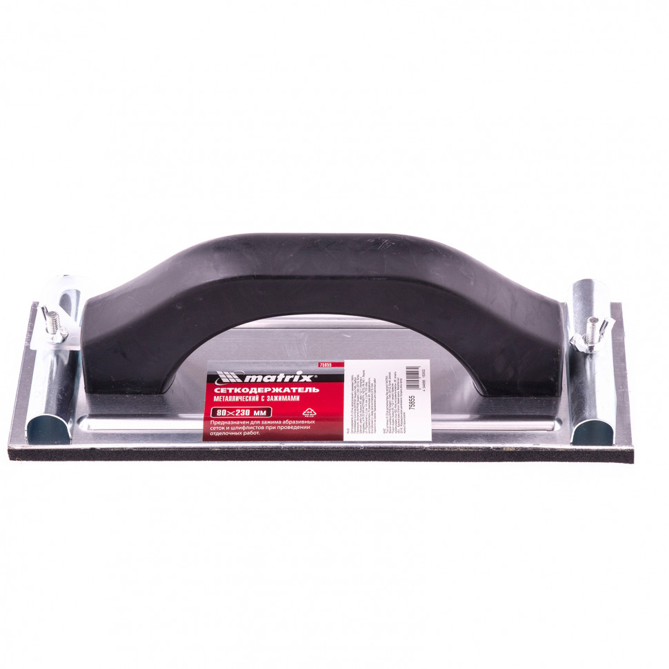 Металлический сеткодержатель Matrix 75855 с подошвой 80 х 230 мм, с зажимами, используется для ручного шлифования деревянных, шпатлеванных, металлических, пластмассовых и прочих твердых поверхностей. Сеткодержатель фиксирует абразивную стеклосетку или шлифлист и позволяет удалять старые отделочные покрытия, подготавливать поверхность под покраску, а также выполнять чистовую обработку.