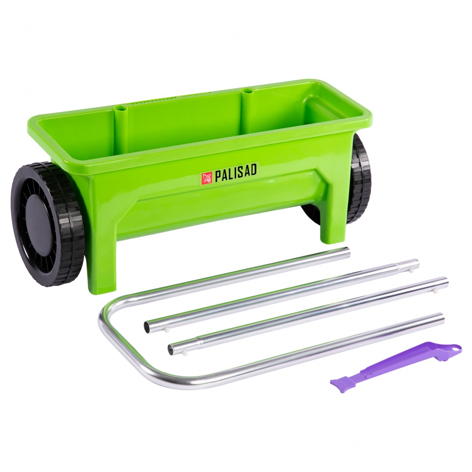 Корыто с заслонками - 1 шт, Верхняя часть ручки (дуга) - 1 шт, Нижняя часть ручки (прямые) - 2 шт , Дозатор - 1 шт, Планка дозатора - 1 шт, Колесо - 2 шт, Ось - 2 шт, Винты крепления планки дозатора - 2 шт, Втулки - 2 шт |