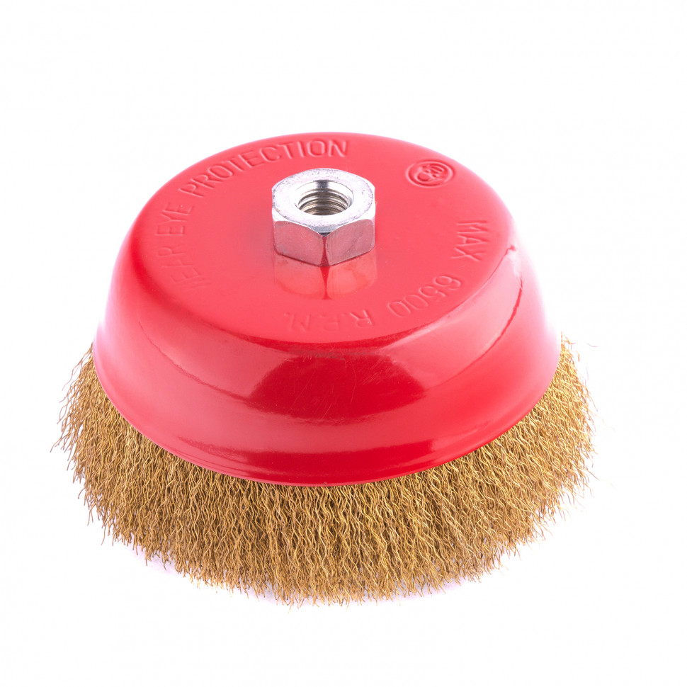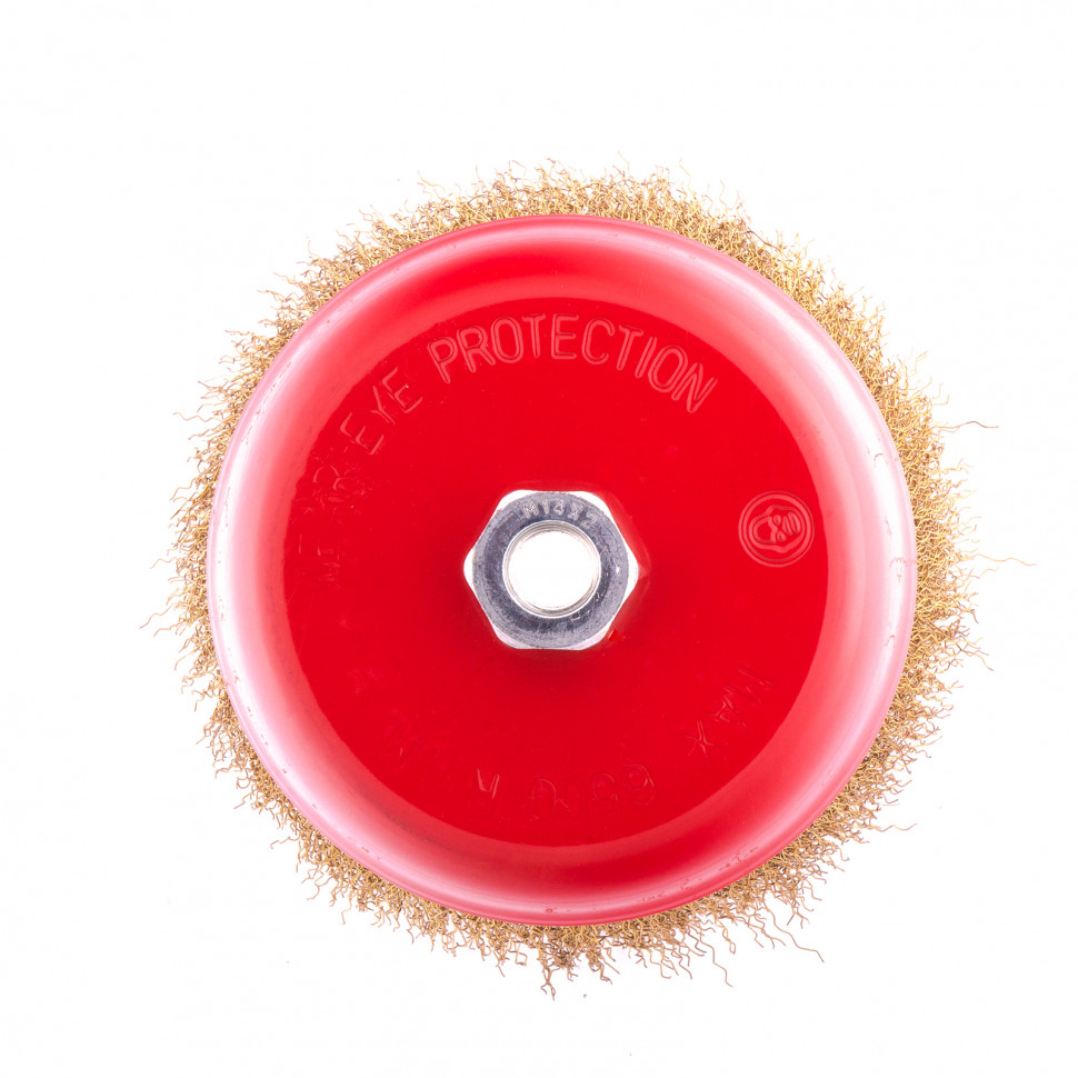 Щетка «чашка» Matrix 74607 диаметром 150 мм, с щетиной из латунированной витой проволоки, устанавливается на вал УШМ с помощью гайки М14. Предназначена для снятия тонкого слоя краски или лака, удаления ржавчины и загрязнений. При рекомендованной скорости вращения 4500 об/мин щеткой можно быстро обрабатывать участки большой площади.
