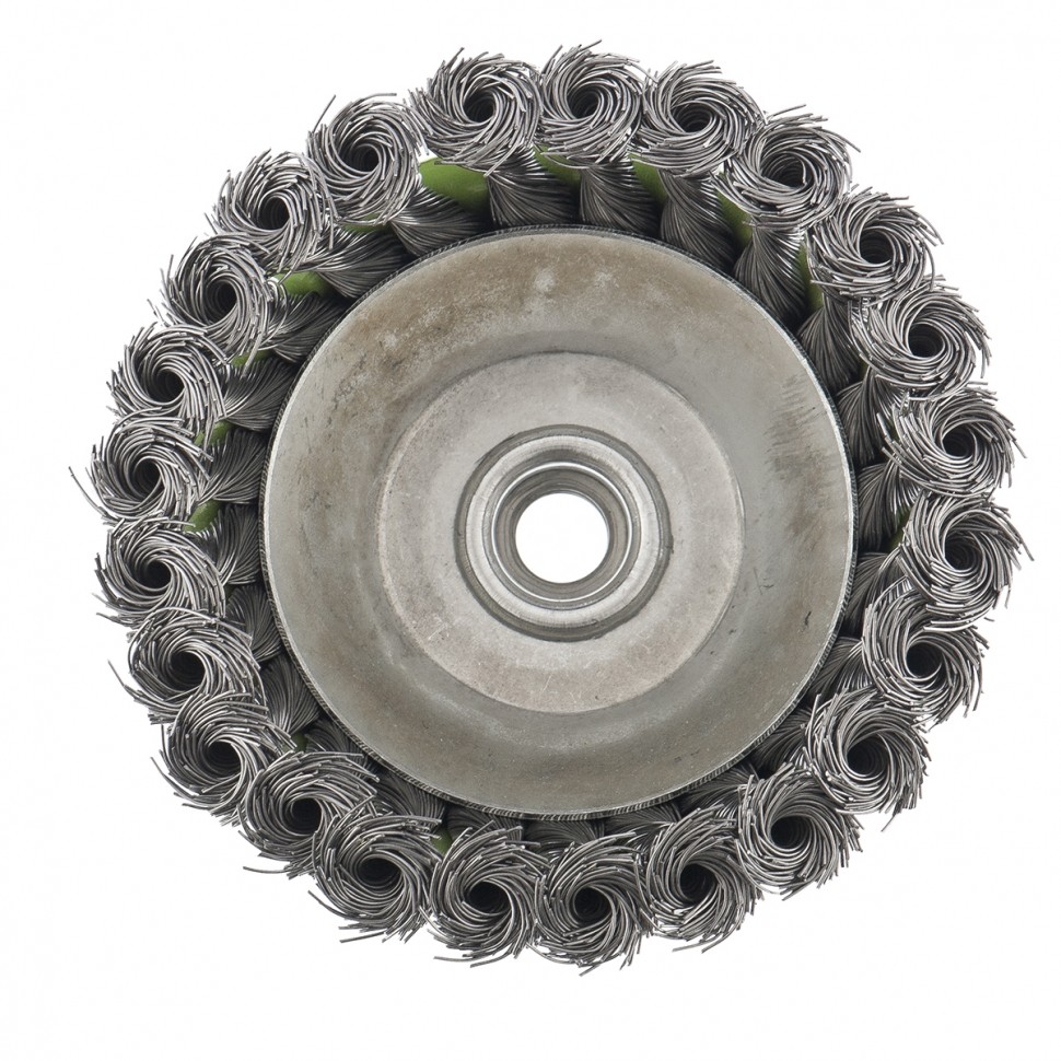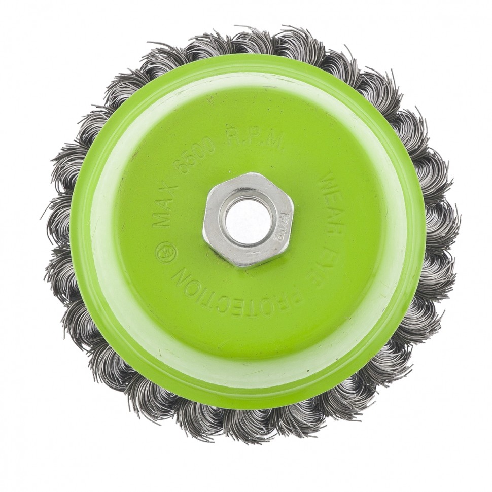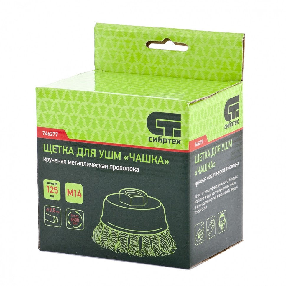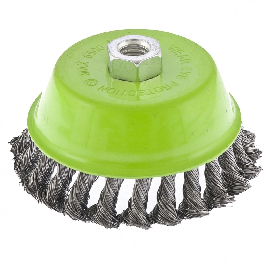 Щетка Сибртех «Чашка» 746247 диаметром 75 мм, с присоединительной резьбой М14, с щетиной из крученой проволоки диаметром 0,5 мм, устанавливается на УШМ, поддерживающую работу со скоростью 12500 об/мин. Изделие предназначено для грубой (черновой) обработки поверхностей и подходит для удаления загрязнений, снятия толстого слоя ржавчины, ЛКМ, зачистки сварных швов.