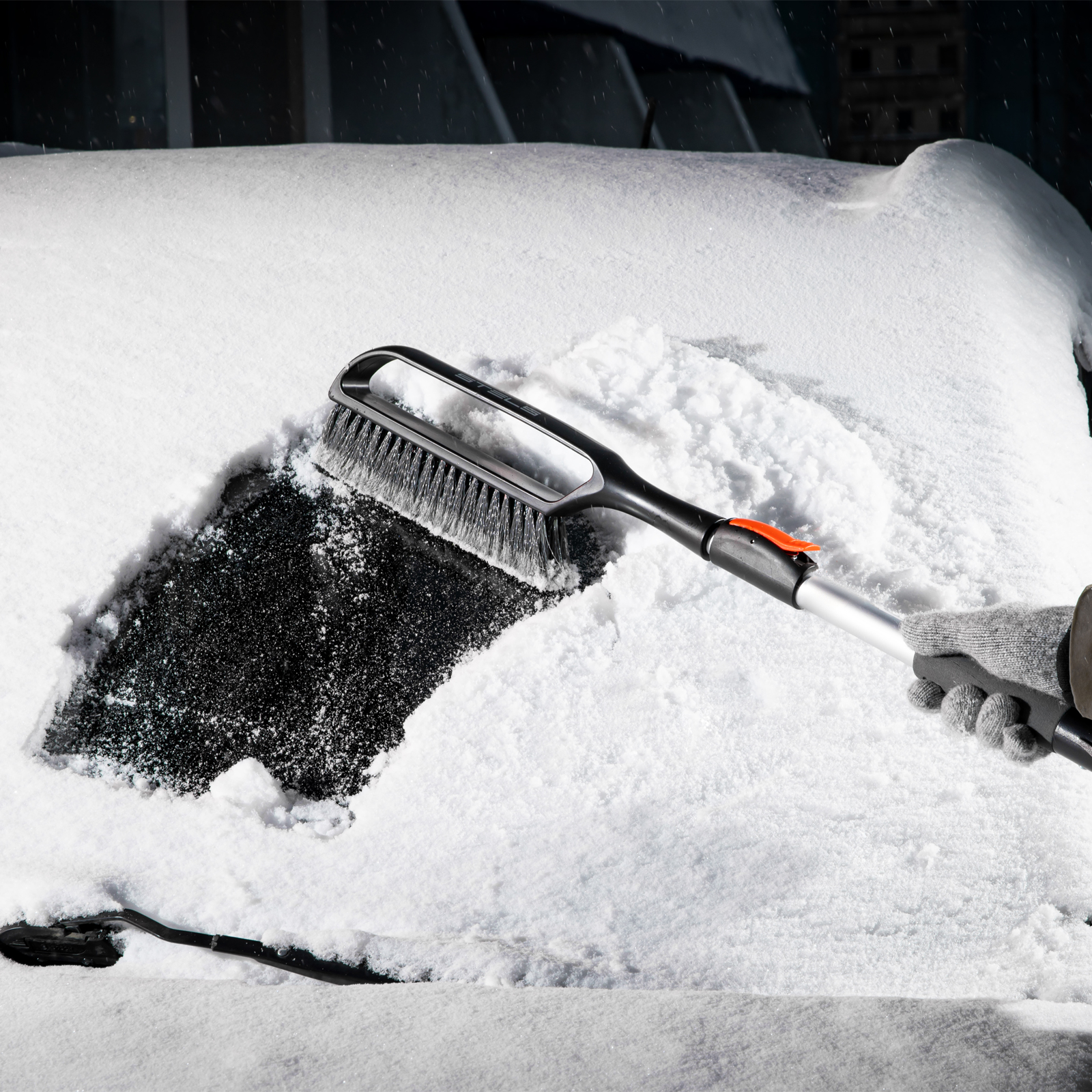- Щетка-скребок имеет плотную щетину, распушенную на концах, поэтому эффективно убирает слой снега, не царапая поверхность кузова.