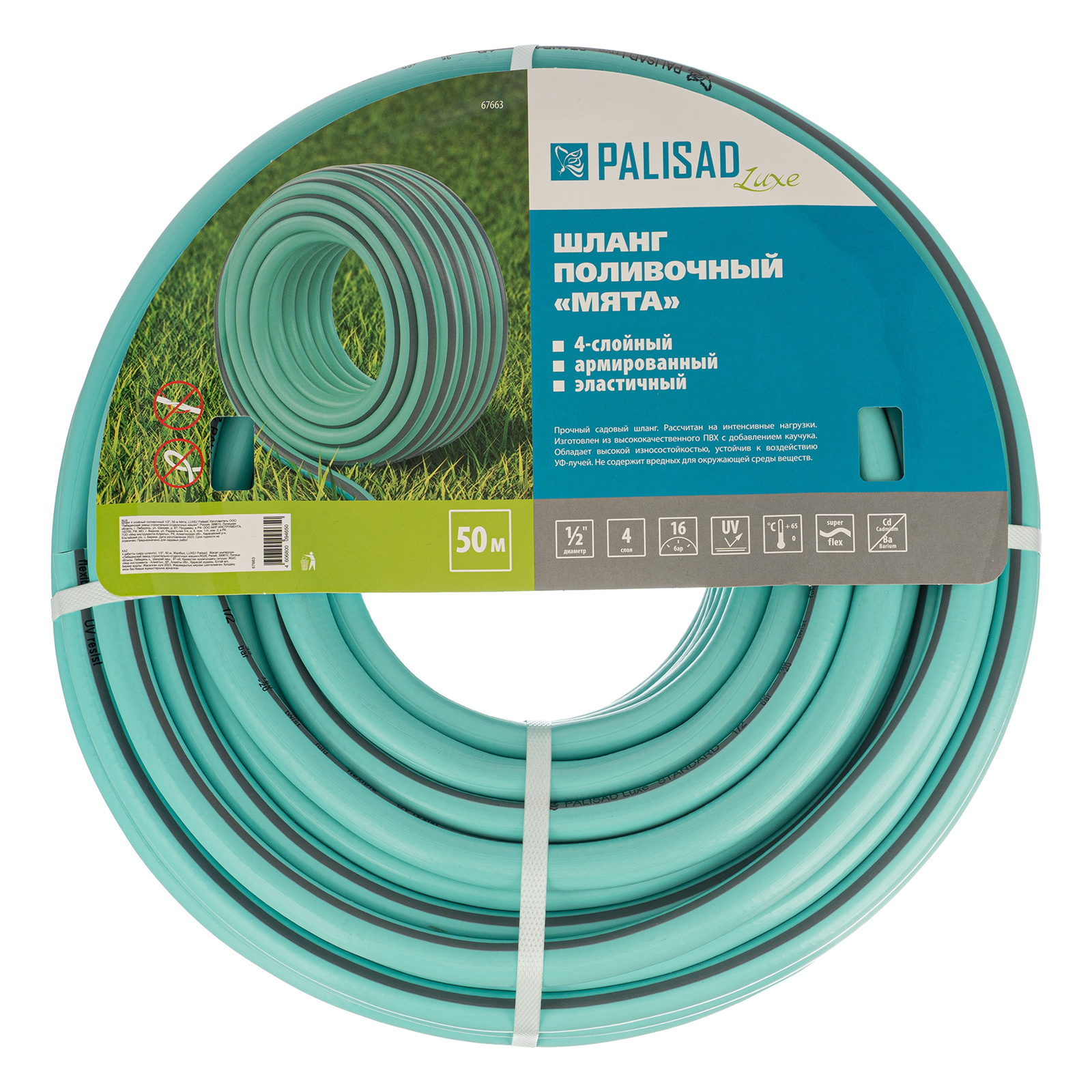 Шланг поливочный армированный 4-слойный Palisad LUXE Мята 67663 длиной 50 м и диаметром 1/2"" предназначен для повседневного использования. Пригодится дачникам для орошения сада, огорода или газона. Шланг подходит для всех поливочных систем Palisad и Palisad LUXE.