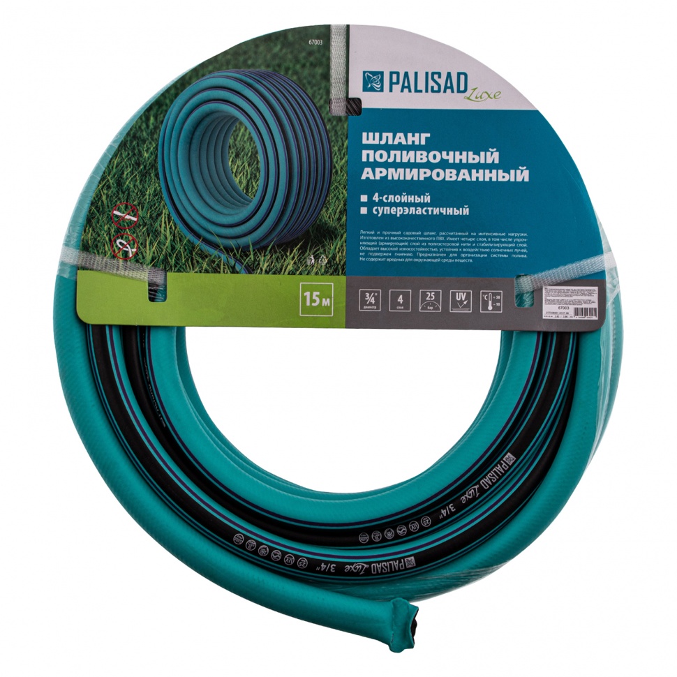 Армированный 4-слойный поливочный шланг Palisad LUXE 67003 длиной 15 м и диаметром 3/4 дюйма — это незаменимое приспособление для владельцев садово-огородных участков. Он позволяет организовать автоматическую систему орошения или осуществлять его вручную.