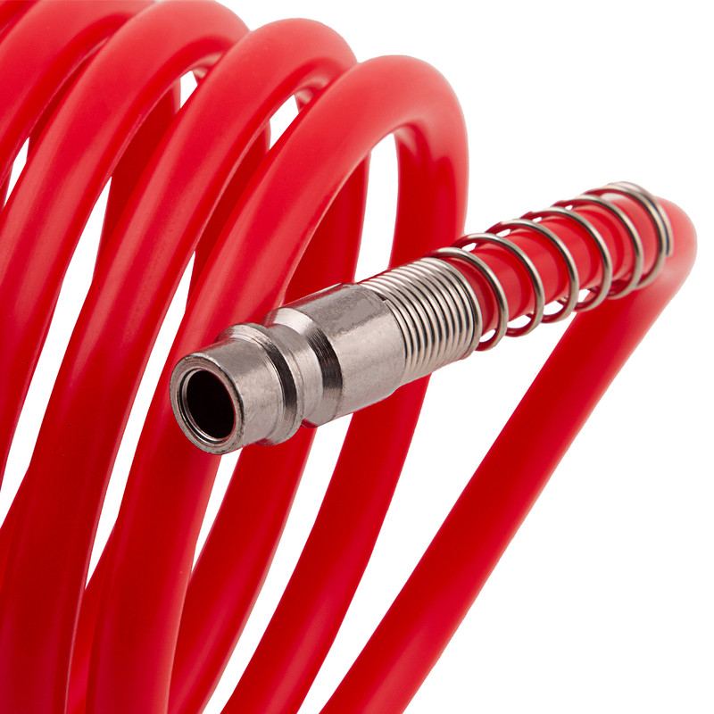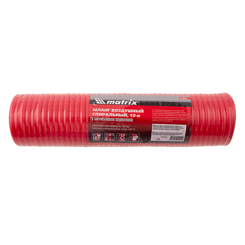 Спиральный воздушный шланг Matrix 57004 длиной 10 м, с быстросъемными соединениями, используется для подключения пневмоинструментов к компрессору. Изготовлен из легкого полиэтилена, за счет чего даже длительная работа не вызывает усталости. Имеет форму спирали, поэтому его не нужно скручивать после работы. Рукав пригодится в автосервисе, слесарной мастерской, а также во время отделочных работ.