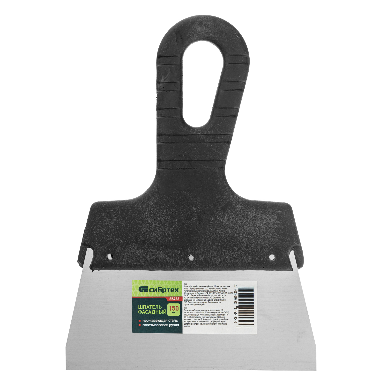 Шпатель фасадный Сибртех 85436 с полотном шириной 150 мм из нержавеющей стали и пластмассовой ручкой рассчитана на нанесение, выравнивание и сглаживание строительных растворов и смесей. Актуальна при проведении ремонтно-отделочных работ, подходит для начинающих и профессиональных мастеров.