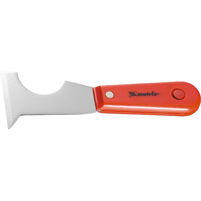Стальной шпатель-скребок Matrix 85299 с пластмассовой ручкой имеет лезвие сложной конфигурации и является многофункциональным инструментом. Используется для удаления старых обоев, клея, излишков краски с валиков, снятия тонкого слоя ржавчины с металлических поверхностей, зачистки труб и т. д.