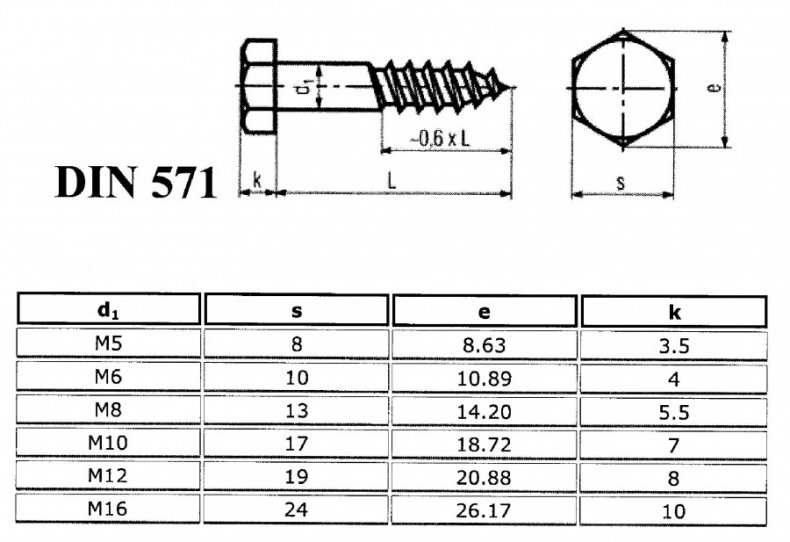 • Размеры: шестигранная головка под ключ — 7–24 мм, высота — 2,8–10 мм. Стержень шурупа может быть длиной от 20 до 300 мм при диаметре 4–17 мм. Нарезка наносится не более чем на 0,6 длины изделия