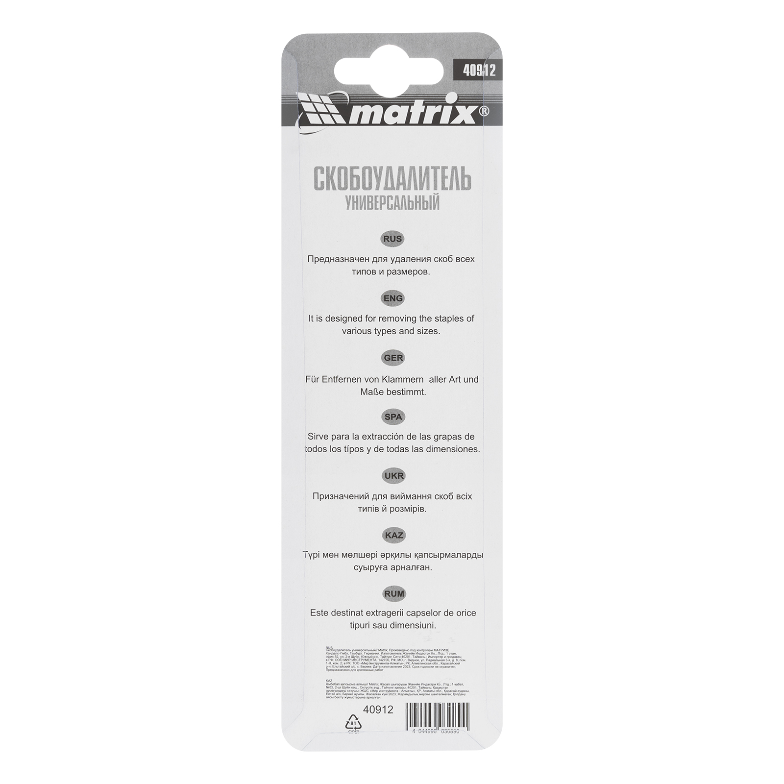 Универсальный скобоудалитель Matrix 40912 быстро и аккуратно удаляет ненужные скобы. Является необходимым дополнением к степлеру и значительно упрощает выполнение работ большого объема. Подходит для профессионального и бытового использования.